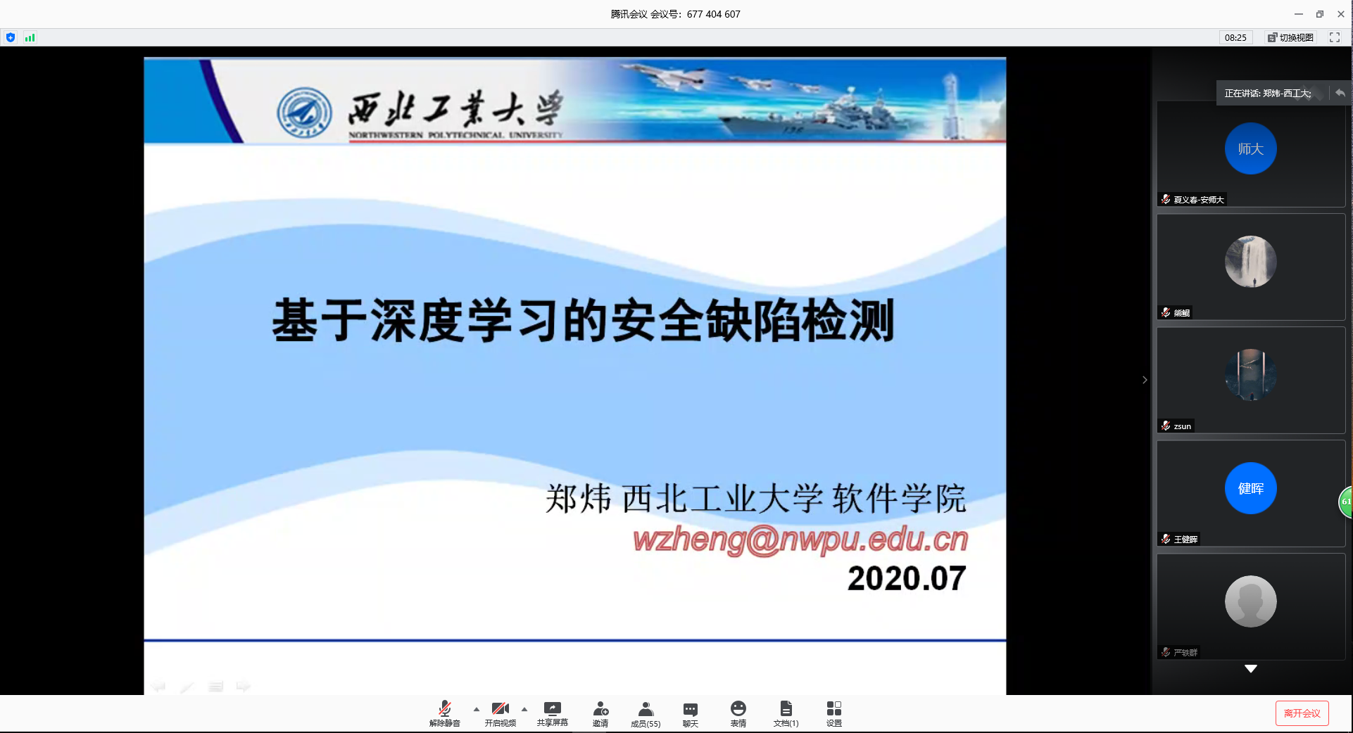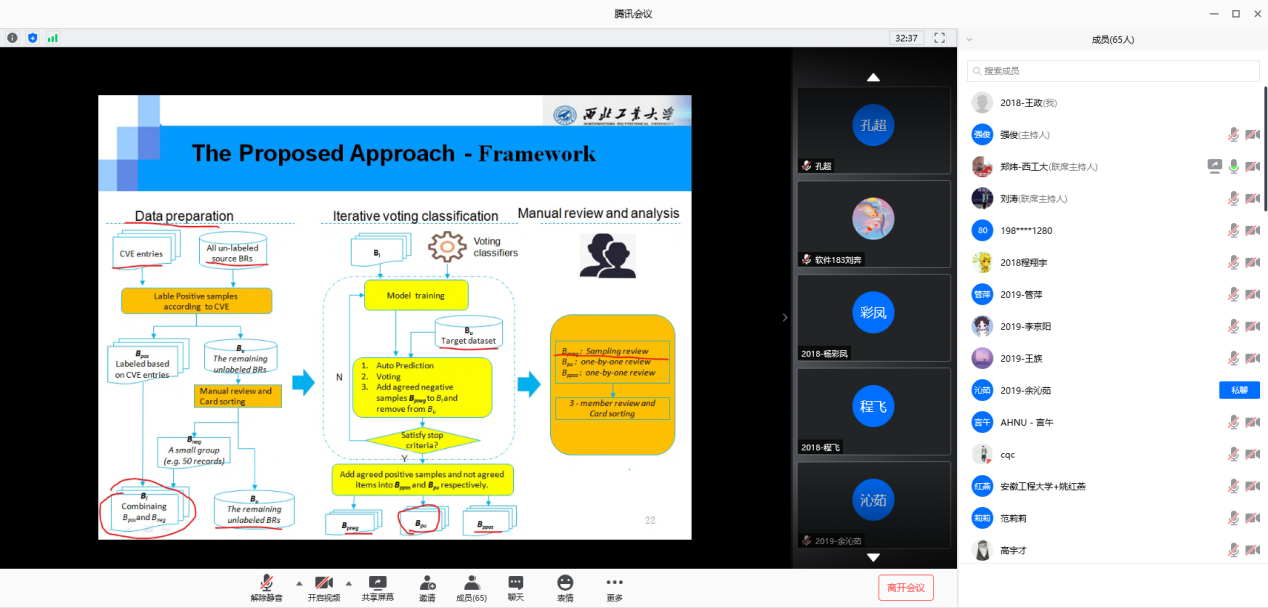 2020年7月22日晚,计算机与信息学院2020年暑期学术交流系列活动正式拉开帷幕。首场学术报告邀请了西北工业大学博士生导师、郑炜副教授通过腾讯会议作题为“基于深度学习的安全缺陷报告预测实证研究”的报告,计算机学院部分教师、研究生、本科生聆听了此次报告。