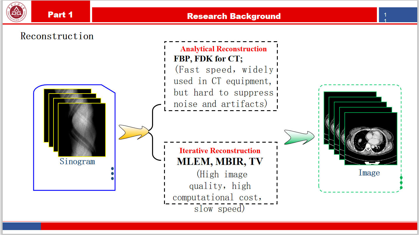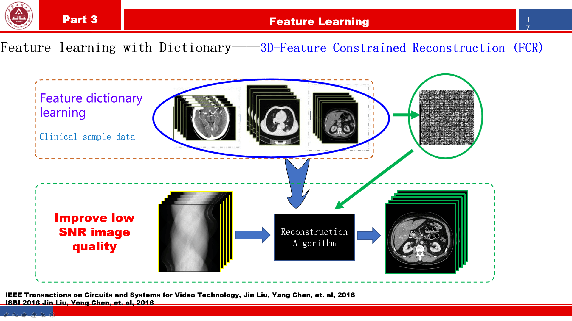 刘进老师分别从研究背景、传统学习方法、特征学习、应用等四个方面对此次报告内容进行阐述。首先,刘进老师简单介绍了目前低剂量CT成像的研究背景;其次,针对传统的学习方法无法优化因斑点噪声和条纹带来的成像退化现象,从而引出了特征学习方法,并对特征学习几种类型作了详细的介绍。最后,刘进老师列举了生活中利用特征学习的低剂量CT成像技术的实际应用,指出了该课题研究的研究意义与价值。