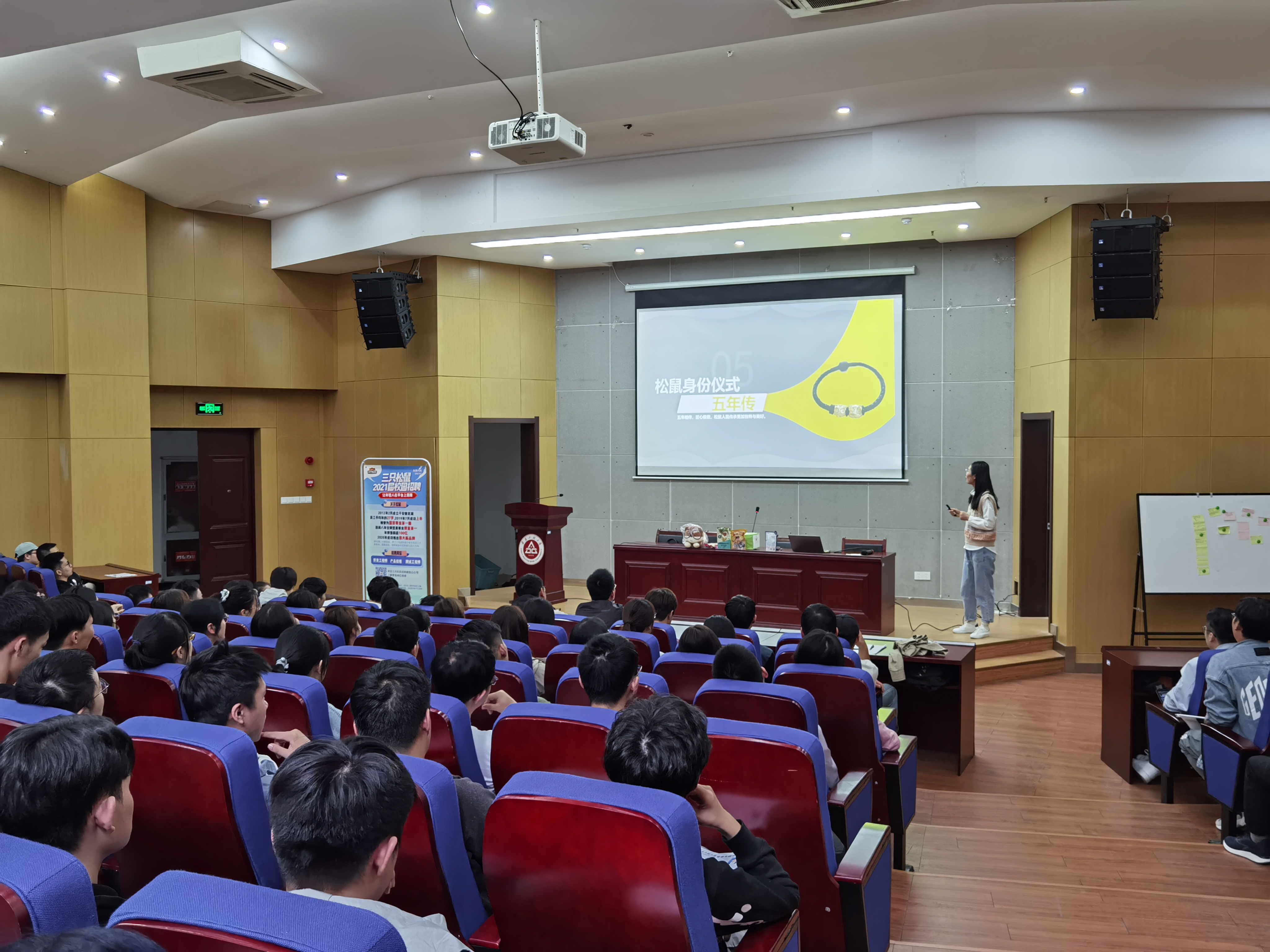 宣讲会上,三只松鼠人事部负责人“鼠迷鹿”通过播放宣传片和PPT展示,向同学们介绍了三只松鼠的企业文化、人员需求、员工福利和发展优势,并回顾了公司的创业经历与发展历程。在互动提问环节中,同学们踊跃提问,鼠迷鹿一一耐心解答,并向同学们赠送了三只松鼠新品以及未公开发售的玩偶,现场气氛十分热烈。三只松鼠HR、技术部高管亲临招聘会现场,用激情澎湃的宣讲将现场气氛推向一个又一个高潮。现场很多同学们主动递交个人求职简历,并积极与HR交流探讨。