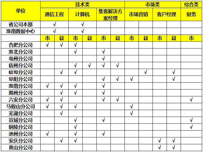 招聘职位:省、市、县公司技术、市场、综合类职位,具体如下: