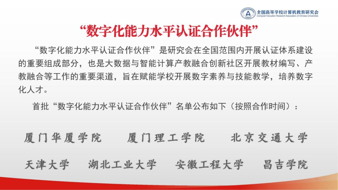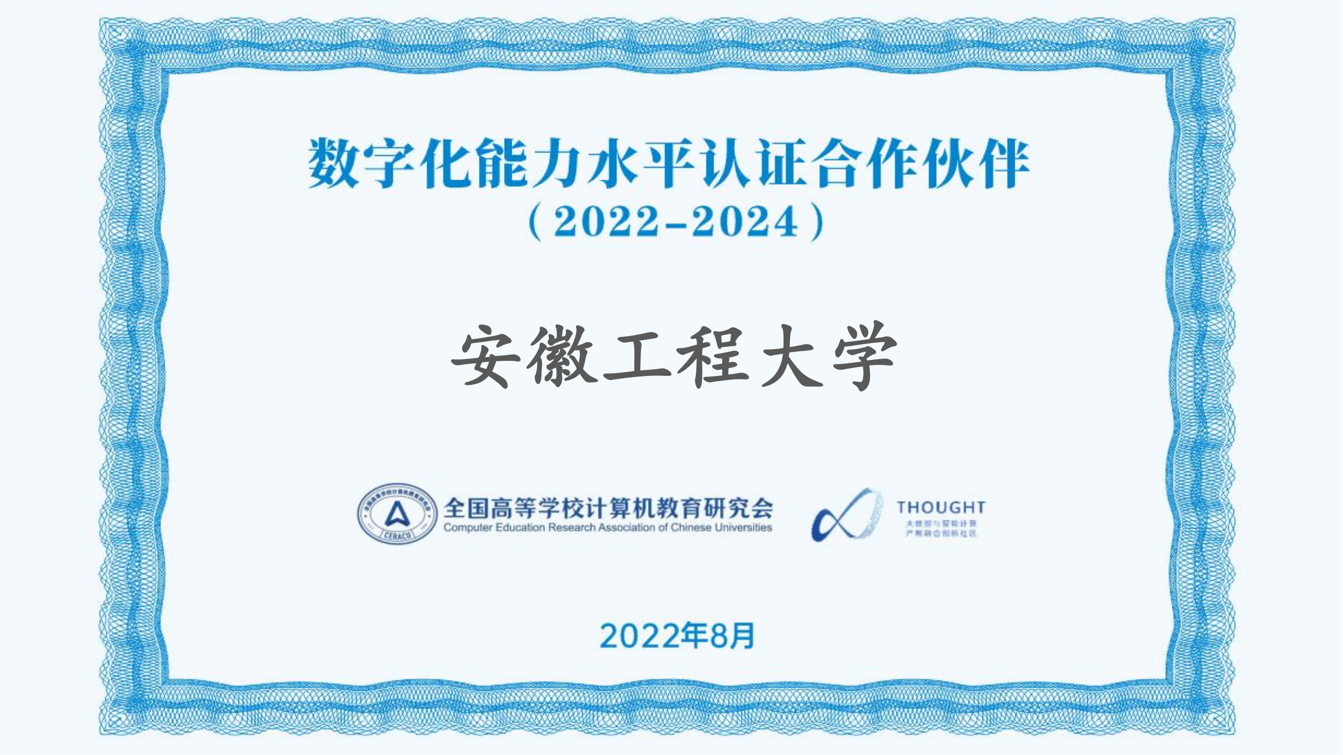 为响应中央网络安全和信息化委员会印发《提升全民数字素养与技能行动纲要》,提升我校本科生的数字素养,培养数字化人才,计算机与信息学院组织相关教师参加了“数字素养与技能”的全国标准的讨论与修订,我校也于2022年8月成为首批由全国高等学校计算机教育研究会主办“数字化能力水平认证”合作伙伴。该认证面向社会,用于考察个人的数字素养与技能、数据科学知识以及组织的数字化转型能力的全国性的认证体系。