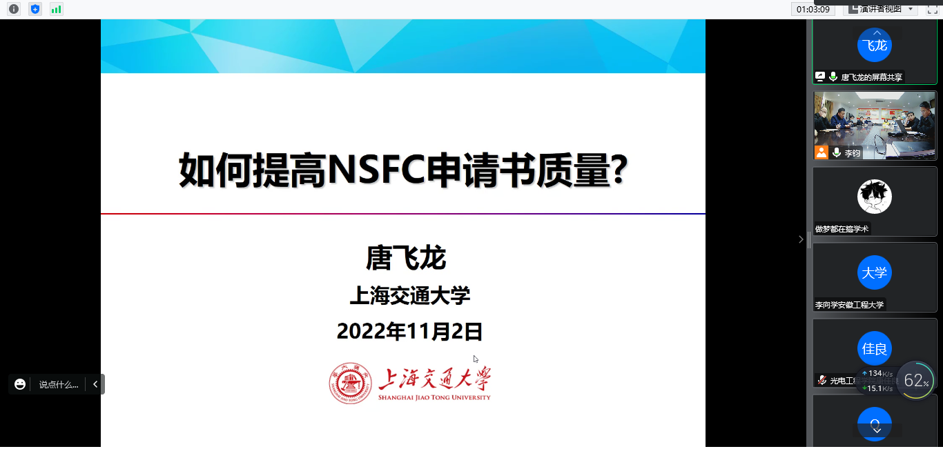 为推动2023年度国家自然科学基金的申报工作,提升国家基金项目的申报质量,11月2日,科技处、研究生部与计算机与信息学院邀请上海交通大学唐飞龙教授作国家自然科学基金项目申报线上辅导报告。学院拟申报国家基金的教师和其他教师分别通过线下线上方式参加了报告会,报告会由王勇教授主持。