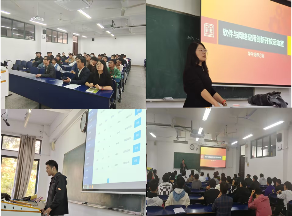 会上,马孜壮主要介绍了软件与网络应用创新开放活动室的主要工作和研究方向,各项目负责人介绍了目前在研项目的进展情况。刘贵如作为活动室兼协会负责老师,主要介绍了活动室培养学生的方案以及对新会员的具体要求,并鼓励大家树立信心,坚持自己的兴趣,努力提升自己。汪国武、王陆林两位老师有多年的企业工作经历,他们从专业知识的学习方面,为新会员提出了宝贵的建议。最后,周苏杰和杨贤敏两位同学为新会员分享了自己的学习历程以及加入到软网活动室后的收获。