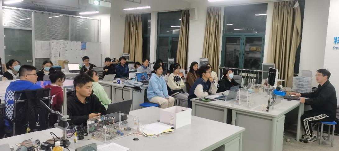 11月4日晚7点,本训练营在物联网开放实验室C704开展了第一次活动。首先,由来自西安电子科技大学芜湖研究院的学长秦文全向参加培训的同学们介绍物联网创新开放活动室发展历程和主要功能,并对安装Arduino软件、配置ESP32环境进行教学。随后采用一对多的教学方式分组教学,由各组组长带领组内成员进行更为细致的教学,针对不同成员的不同问题进行答疑与帮助。本次培训采用了牛牛派开发板,虽然各组间教学进度不尽相同,但在组长的带领下,大多数同学都已掌握了“Hello world!”与“点亮LED灯”程序的运行。