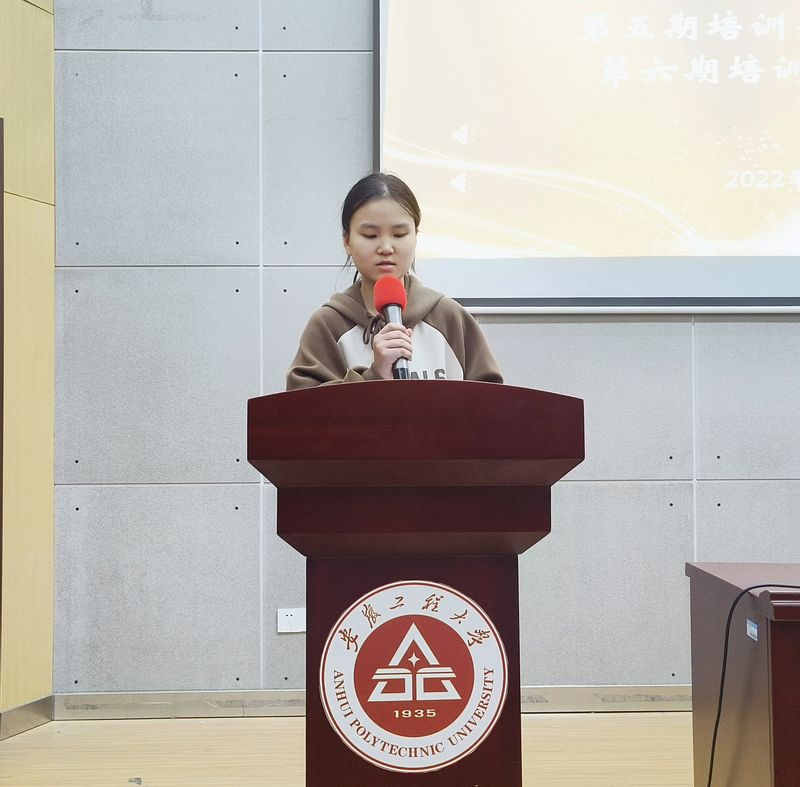 第六期班主任孙力力宣读了考核制度,强调了纪律要求,重点介绍了第六期培训班的学习安排。第六届培训班学员代表软件212潘静茹上台发言,她说,作为新时代大学生,要坚定理想信念、做有理想、敢担当、能吃苦、肯奋斗的新时代好青年。她代表第六期全体学员做出郑重承诺,会加强理论学习,把深入学习习近平新时代中国特色社会主义思想这一马克思主义中国化的最新理论成果作为本次“青马班”学习的重中之重。