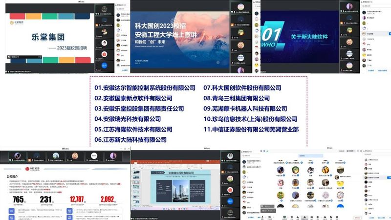 学院对本次线上招聘会高度重视,前期专人负责认真筹备。经招聘信息发布、用人单位报名、学院对宣讲材料进行认真审核,本次招聘会邀请了科大国创软件股份有限公司,江苏新大陆科技有限公司,珍岛信息技术(上海)股份有限公司等11家优质企业单位。招聘会上,各招聘单位通过宣传片介绍、PPT展示等方式向2023届毕业生介绍企业概况、薪资福利、招聘计划及发展前景等情况。在企业洽谈分会场同学们热情高涨,主动了解用人单位情况,聘单位宣讲人针对同学们的问题进行了详细解答。