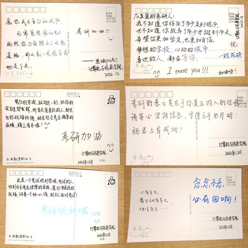 学院近260位正在备战考研的同学收到了这份精心准备的考研礼包,除了考试必备用品,还有学院硬笔书法获奖同学手写的加油卡片,含有学院LOGO的定制笔袋、签字笔和印有“金榜题名”“未来可期”等字样的书签,还有咖啡、巧克力等物品。暖心的礼物、诚挚的关切、殷切的期盼,传递着学院师生对考研学子的美好祝福。“向考研同学送大礼包的活动已经连续开展了多年,是学院的一项传统,也是考研学生共同的珍贵回忆。”院团委副书记吕寅说,“希望同学们从这些精心准备的礼物中,感受到学院对大家的满满关爱和美好祝愿。”