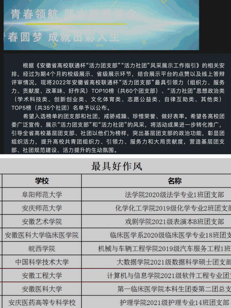 近日,安徽省高校联通杯“活力团支部”TOP10、“活力社团”TOP5榜单发布,根据《安徽省高校联通杯“活力团支部”“活力社团”风采展示工作指引》的相关安排,经过为期4个月的校级展示、省级展示环节,结合展示平台的点赞以及线上答辩评审情况,计算机与信息学院软件211班团支部入选2022年安徽省高校联通杯“活力团支部”最具好作风TOP10榜。
