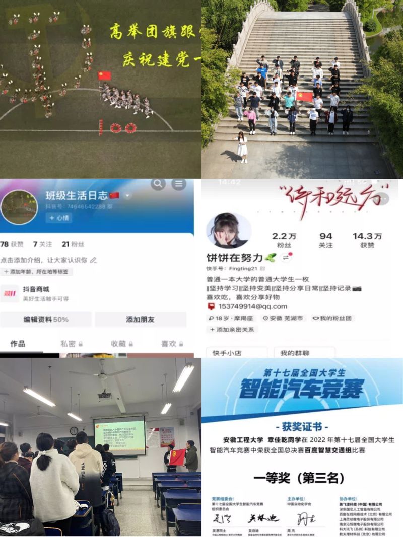 软件工程211班团支部成员锐意进取,奋楫笃行,在宣传、支部建设、学科竞赛等方面取得了显著性成果。团支部宣传展示有力度:定期发布正能量视频激励大家,自媒体平台总粉丝量达2.5w,团支书获“校园大v”称号;支部建设有深度:支部成员积极参加校院两级团学活动,并先后在“我与团旗合个影”摄影比赛、微团课比赛、党的二十大知识竞赛等团学活动中取得优异的成绩。青年大学习、团日活动、组织生活会等活动完成率均达100%,团员的思想政治教育得到强化;学科竞赛有广度:团支部成员学科竞赛获奖达120项。其中国家A类赛事一等奖一项;创新创业有强度:支部同学积极参加“互联网+”大学生创新创业大赛“青年红色筑梦之旅”赛道多个项目获奖,其中获安徽省铜奖一项;支部一名同学注册并运营了一家文化公司;文体建设有气度:支部同学积极参加各类文体竞赛,取得了优异的成绩,增进了团支部同学之间的关系,增强了团支部的凝聚力;志愿服务有温度:支部同学积极参加无偿献血、支教、打扫街道等志愿服务。支部多名同学担任队长带领支部成员参与“团百花”志愿服务活动,切身实地帮助他人,志愿服务参与率高达73%。该班团支书王娜娜说:“少年没有乌托邦,心向远方自明朗。是团支部每位同学的好作为造就了软件211团支部的好作风。”