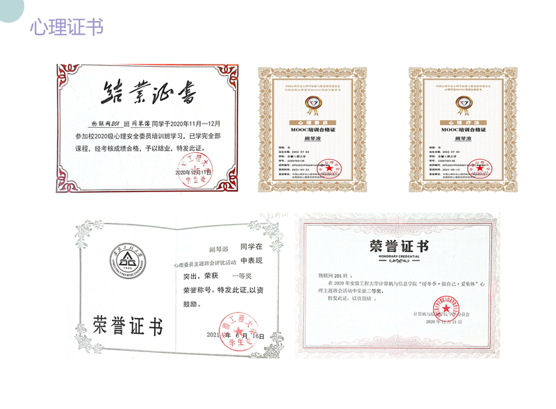 阙琴溶同学连续两年荣获校级“优秀心理委员”,2022年荣获校级“优秀心理委员标兵”称号。三年来,阙琴溶为了做好心理委员的工作,认真对待每一次培训,利用课余时间坚持阅读各种心理知识方面的书籍,多次参加心理讲座,丰富心理学方面知识储备,力求做温暖的人,做有温度的事。在全国高校心理委员工作平台的学习中获得了“心理委员MOOC培训合格证”、“心理疗法MOOC培训合格证”,每有所学所感,就会积极实践,多次发现有心理异常的同学主动引导建议去心理咨询中心做心理咨询。