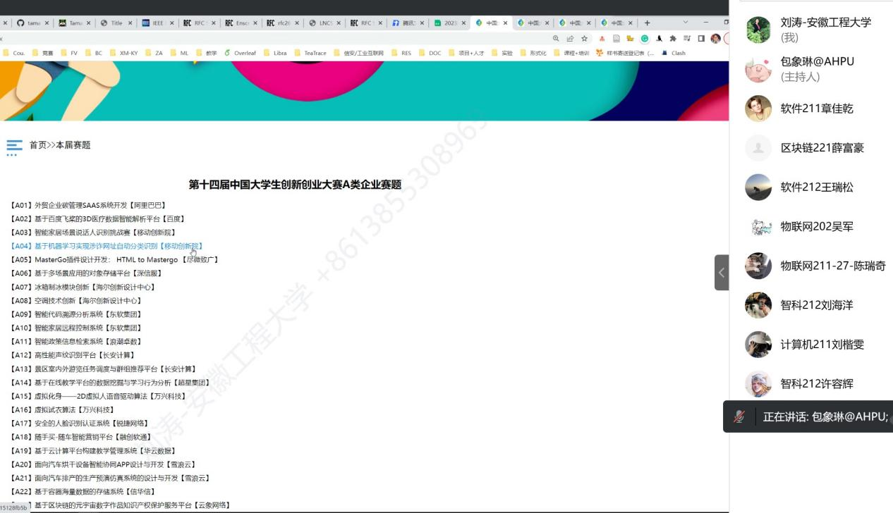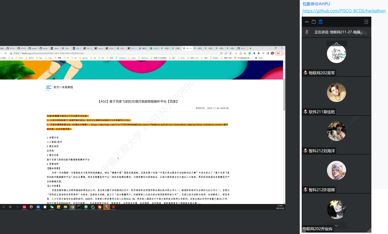 1月8日,物联网创新开放活动室信息安全与区块链小组以腾讯会议的方式开展了第十四届中国大学生服务外包创新创业大赛A类企业赛题交流活动,参加本次活动交流的学生分别来自计算机与信息学院、数理与金融学院、人工智能学院。本次活动由物联网创新开放活动室指导教师包象琳主持,活动室指导教师刘涛教授、徐晓峰博士共同参与。