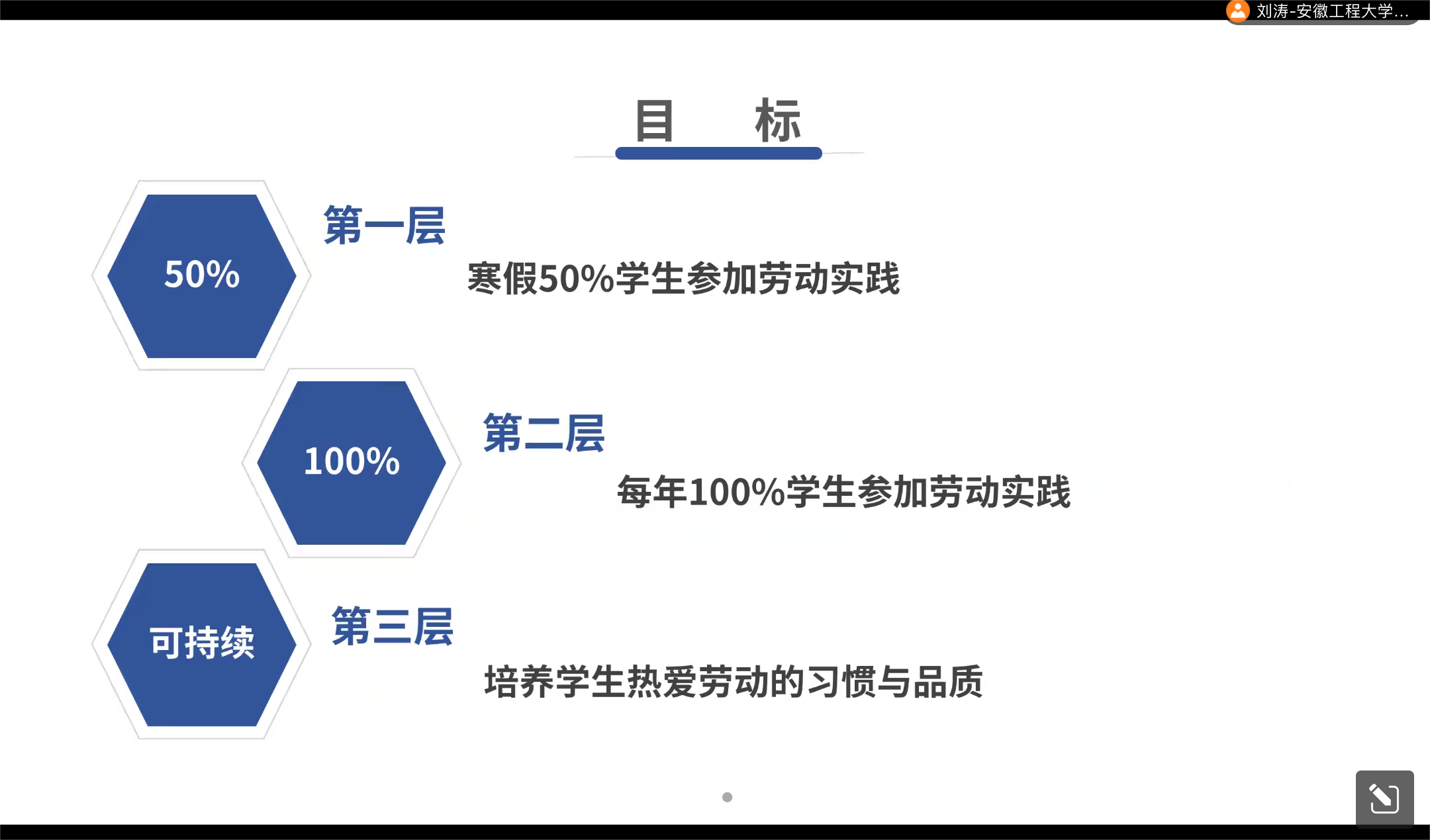 会上,刘涛就“三全六专”——“勤”起来寒假工作进行了解读和布置,坚持“五育并举”, 让劳动教育落地生根,培养学生正确的劳动价值观,引导广大学生崇尚劳动、热爱劳动、辛勤劳动、诚实劳动。要通过劳动教育培养学生社会责任感、创新精神和实践能力。针对学生劳动教育提出三层目标,一是寒假50%学生参加劳动实践;二是每年100%学生参加劳动实践;三是实现可持续性,通过劳动教育培养学生爱劳动的习惯和品质,构建德智体美劳全面培养教育体系,形成更高水平的人才培养体系。强调劳动教育负责老师按步骤落实,特别是先完成寒假任务,也希望寒假期间100%学生参加劳动实践。