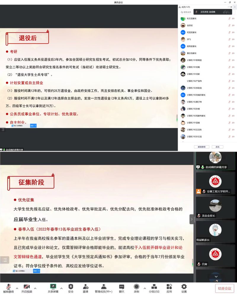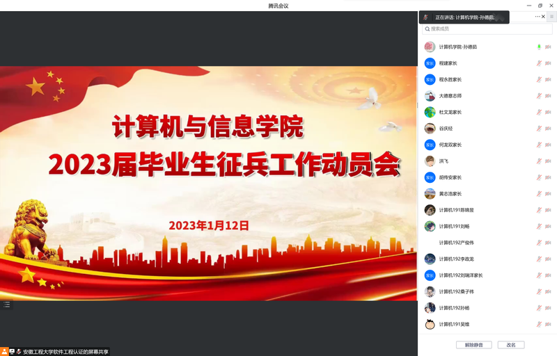 青春意气风发,从戎无上光荣。为进一步鼓励学院2023届毕业生参军入伍,1月12日晚,计算机与信息学院召开线上2023届毕业生征兵工作动员会。学院党委副书记孙德茹、2023届毕业班辅导员、院征兵负责人、毕业生及家长参会,动员会特别邀请校征兵工作站赵成婧进行专业政策解读。