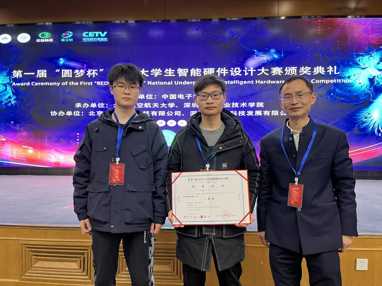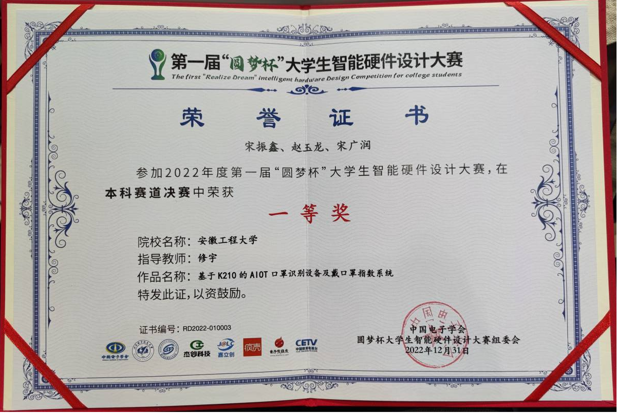 2月25日,由中国电子学会主办、北京航空航天大学和深圳职业技术学院承办的第一届“圆梦杯”全国大学生智能硬件设计大赛总决赛及颁奖典礼在北京航天航空大学落下帷幕。我校计算机科学与技术专业赵玉龙、测控技术与仪器专业宋振鑫物联网工程专业宋广润同学在指导老师修宇指导下设计的作品“基于K210的AIOT口罩识别设备及戴口罩指数系统”斩获全国决赛一等奖。