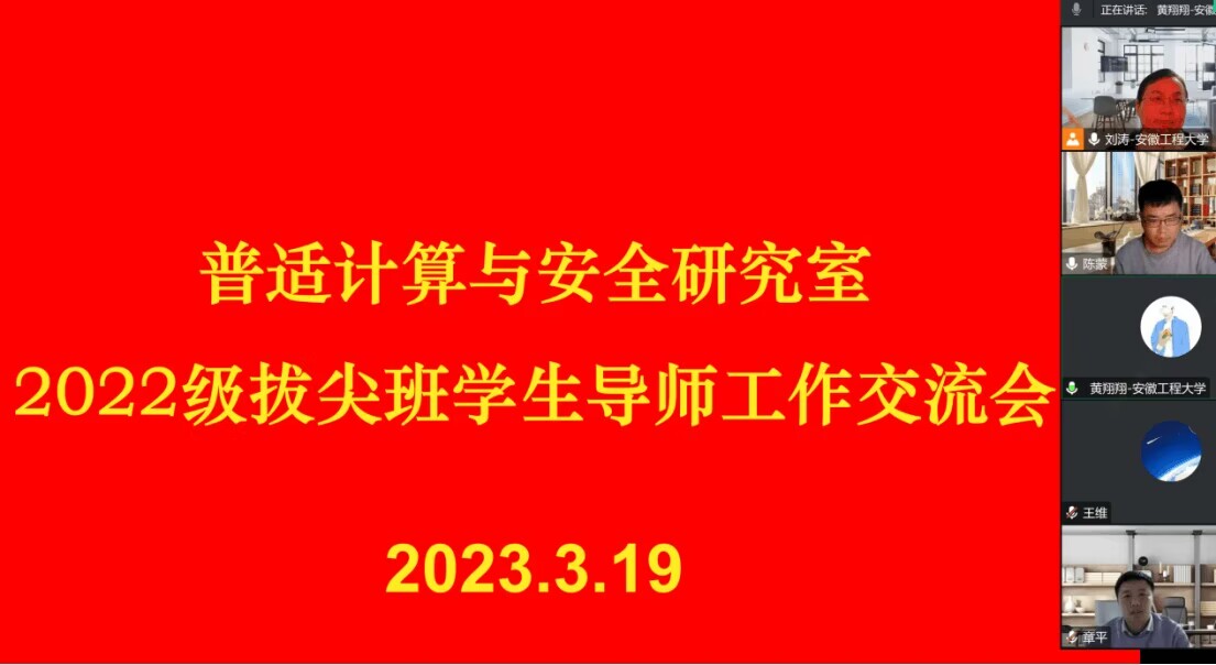 根据学院工作安排,计算机(拔尖)221班所有同学完成了进团队、选导师工作,为了让加入普适计算与安全团队的拔尖班同学明确学习目标、激发学习热情、坚定学习信念,3月19日和20日,计算机与信息学院普适计算与安全研究室的指导教师和学生就来自计算机(拔尖)221班4位同学的培养目标、培养模式、过程管理等分别进行了线上和线下的深入交流和探讨。