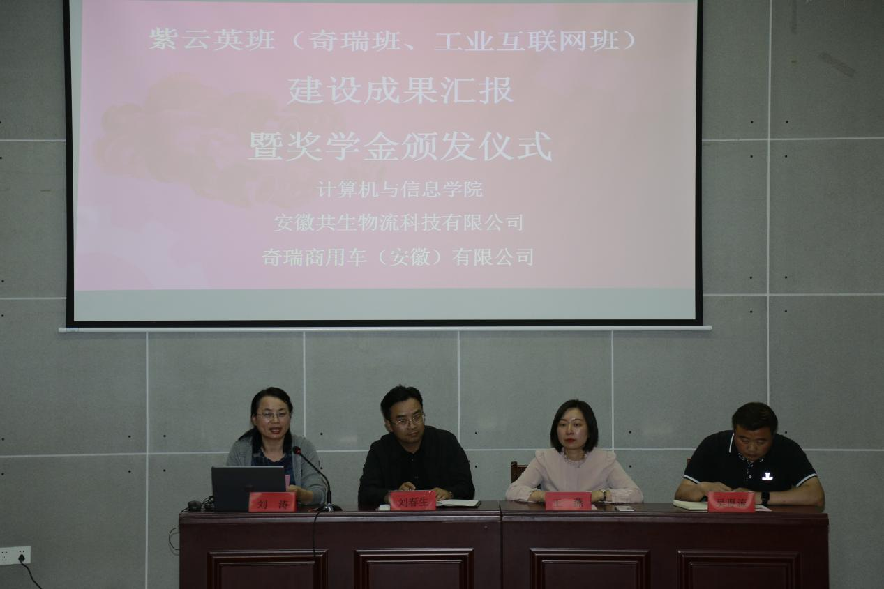 5月10日下午,计算机与信息学院在学院报告厅举办了紫云英班建设成果汇报暨“奇瑞班”奖学金颁发仪式。会议由副院长刘涛主持,安徽共生物流科技有限公司总裁刘春生、创新发展部总监郭武,奇瑞商用车(安徽)有限公司IT经理杨春、专用车分公司项目总监朱士田、人力资源部高级经理王燕、经理吴厚流,物联网工程系主任刘三民、副主任章平,紫云英班辅导员魏晓飞、王鸣鹃,以及紫云英班(奇瑞班、工业互联网班)全体学员参加会议。