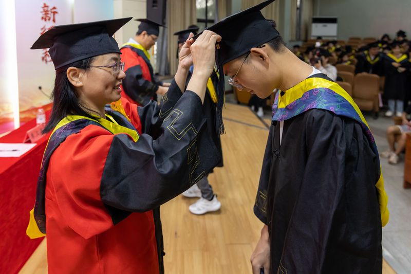 在嘹亮的国歌声中,毕业典礼正式拉开帷幕。这一典礼不仅是毕业季的最后一堂公开课,也是一堂蕴含师生情的“饯行课”、一堂成长前行的“励志课”、一堂紧扣立德树人的“思政课”。