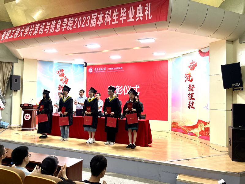 在院党委书记李卫东、院长汪军宣读完2023年安徽省优秀毕业生和学校优秀毕业生名单后。校领导和院党政领导分别为获表彰学生颁发了荣誉证书和毕业纪念品。