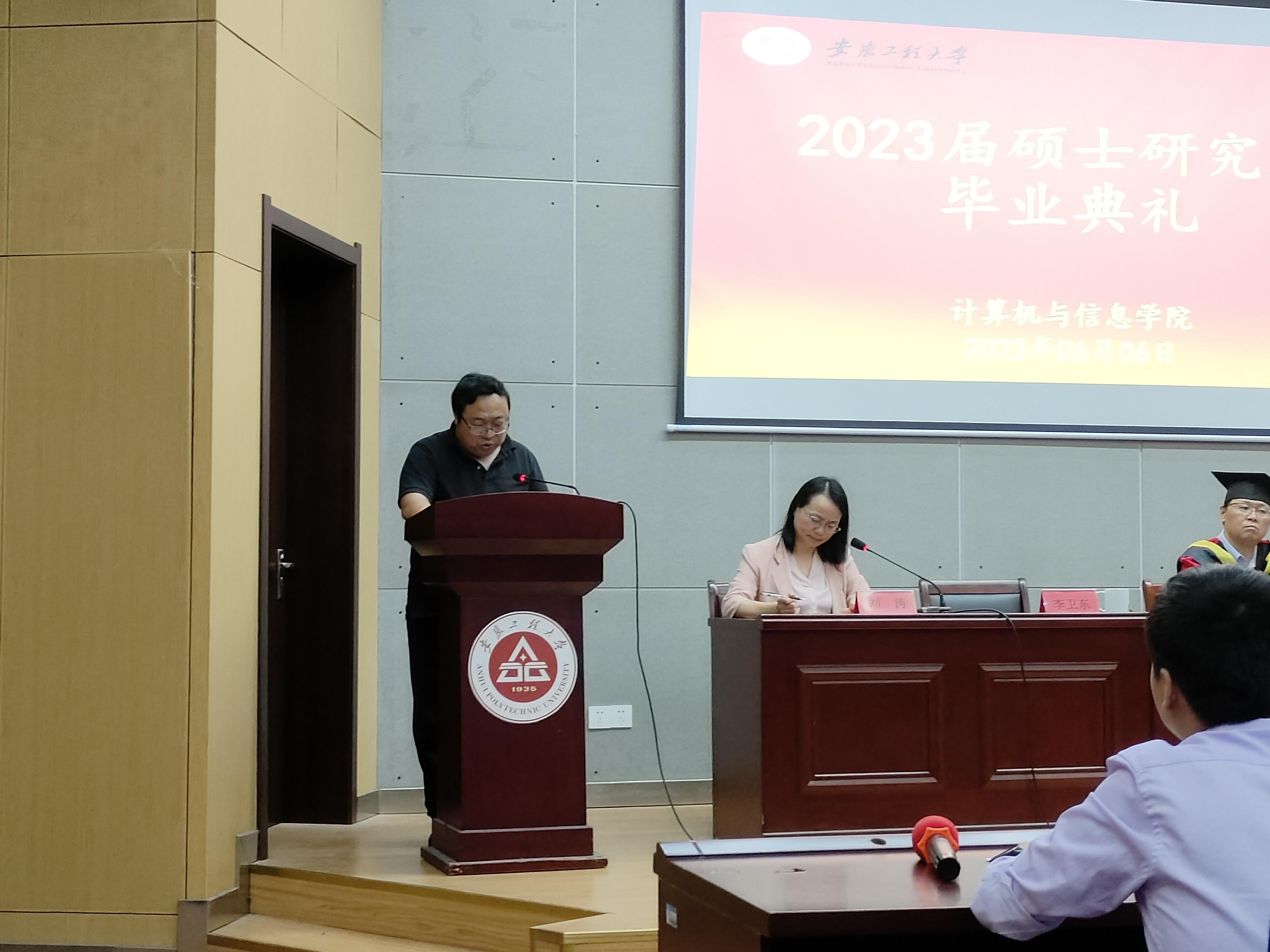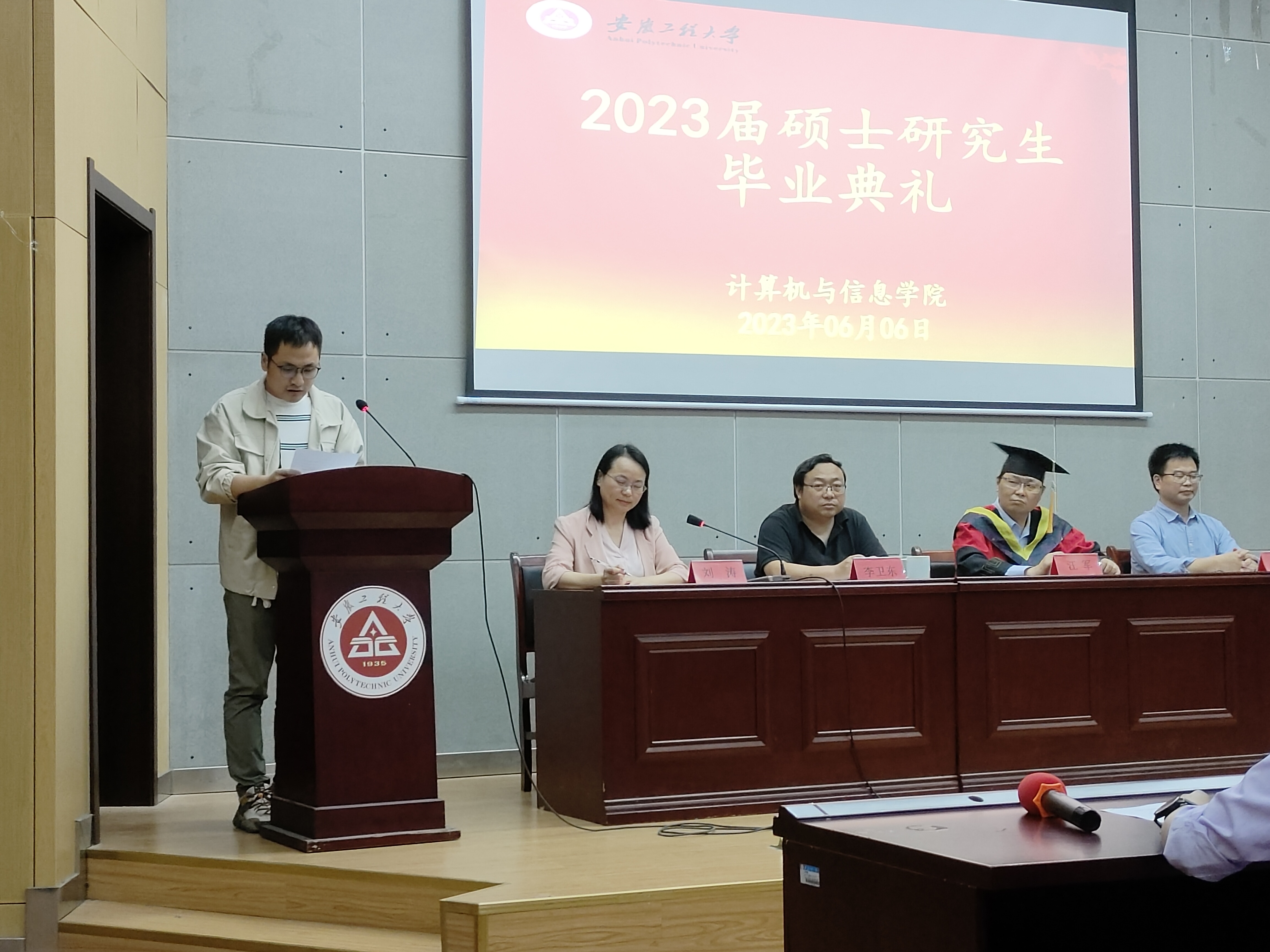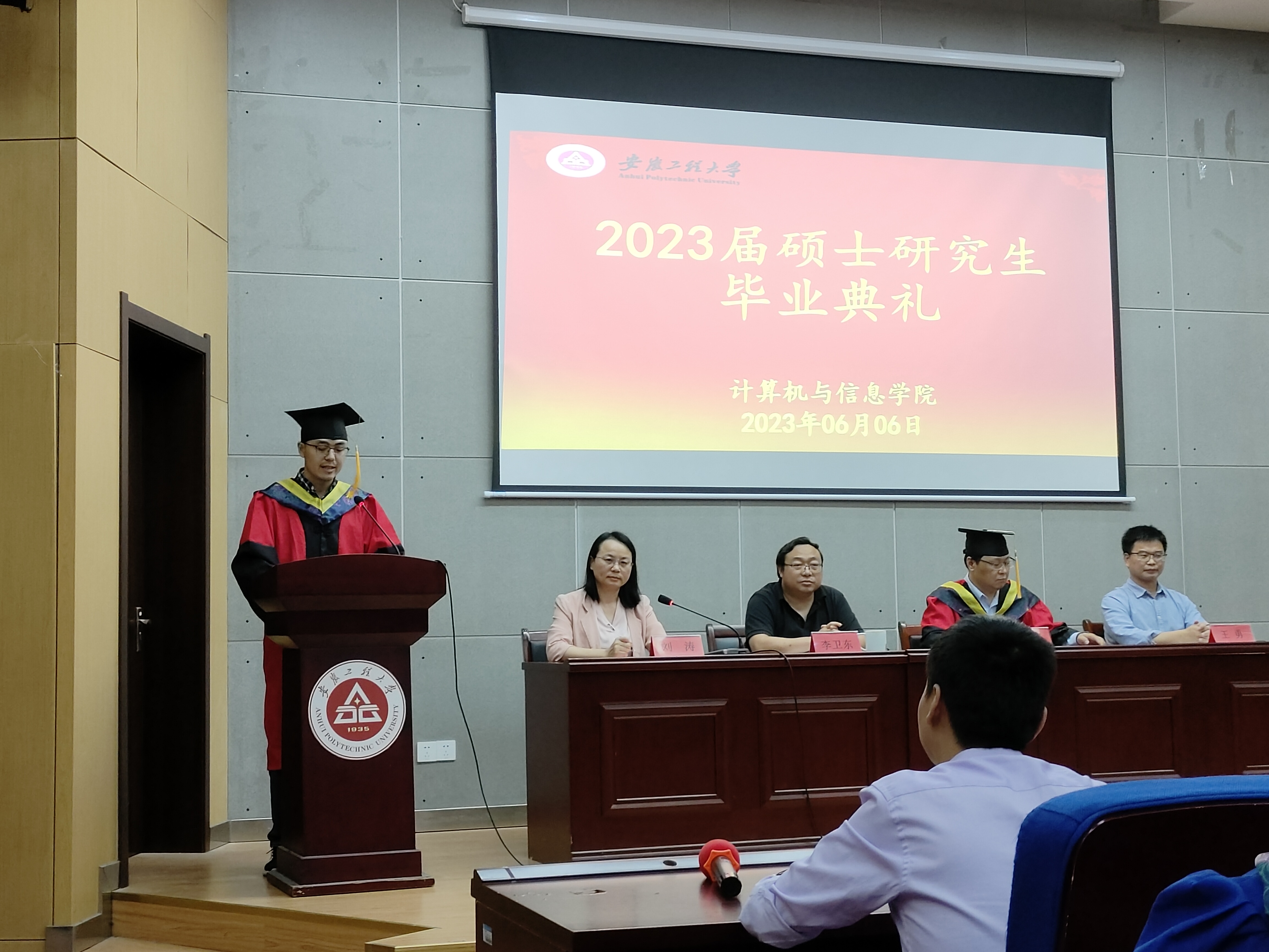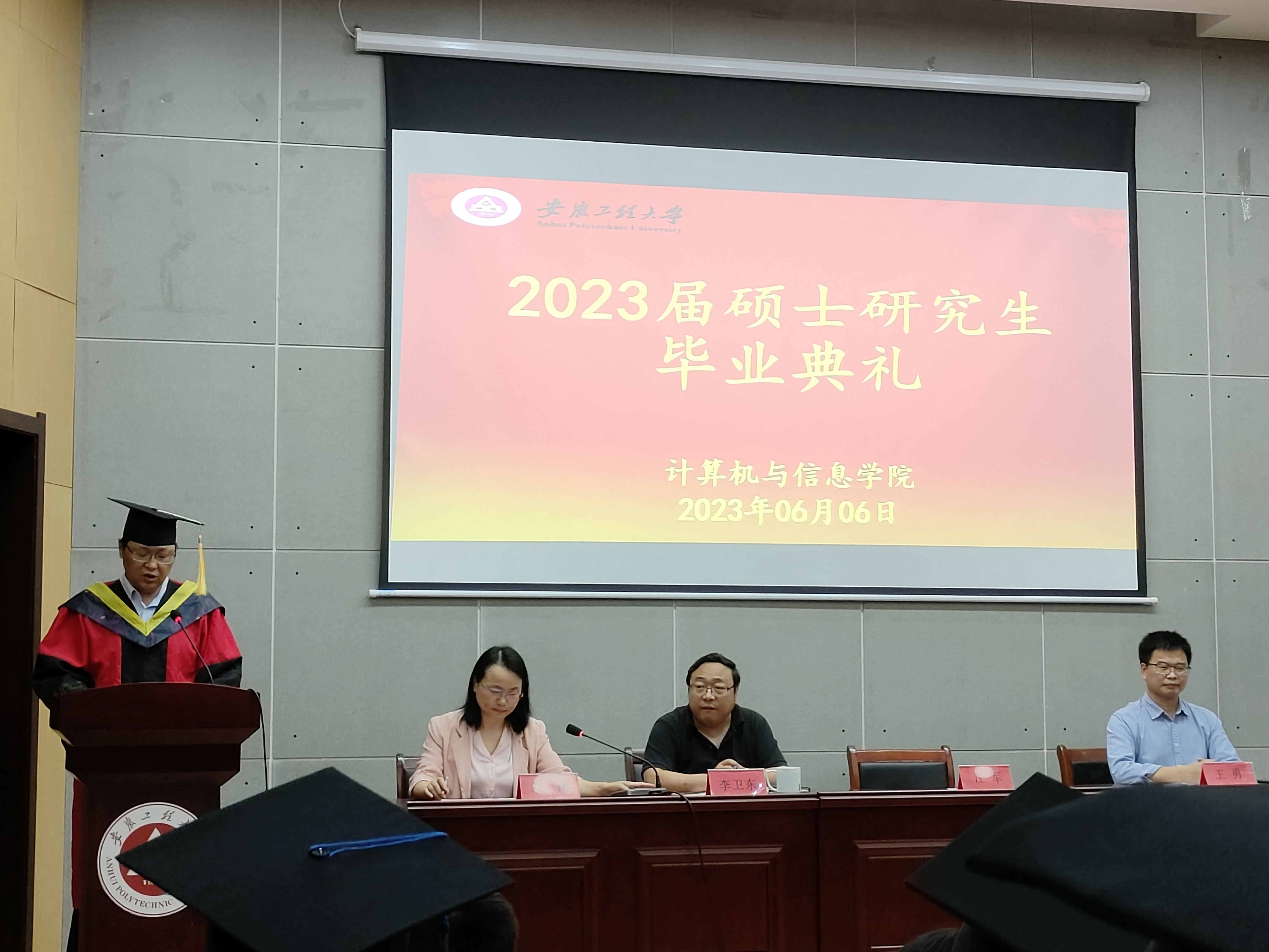 6月6日下午,计算机与信息学院2023届硕士研究生毕业典礼在C座5楼报告厅隆重举行。院党委书记李卫东、院长汪军、教学副院长刘涛、科研副院长王勇、硕士生导师、教师代表、全体硕士研究生参加了本次毕业典礼。典礼由刘涛主持。