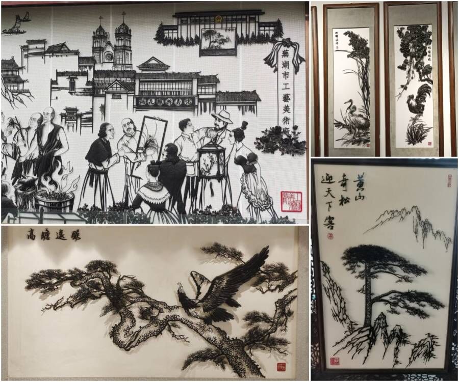 铁画以锤为笔、以铁为墨、以砧为纸、锻铁为画,是中国工艺美术百花园中的一朵奇葩。队员们在芜湖市博物馆,欣赏了许多著名铁画,了解了铁画的历史、发展现状以及政府对非遗铁画所出台的保护政策。铁画种类多样,小到一个相框,大到一整面墙。通过各个年代的铁画艺术品,可以同时代对话,同艺术家们畅谈,惊叹于铁画艺人精湛的技艺,折服于铁画艺术家独到的设计思想。