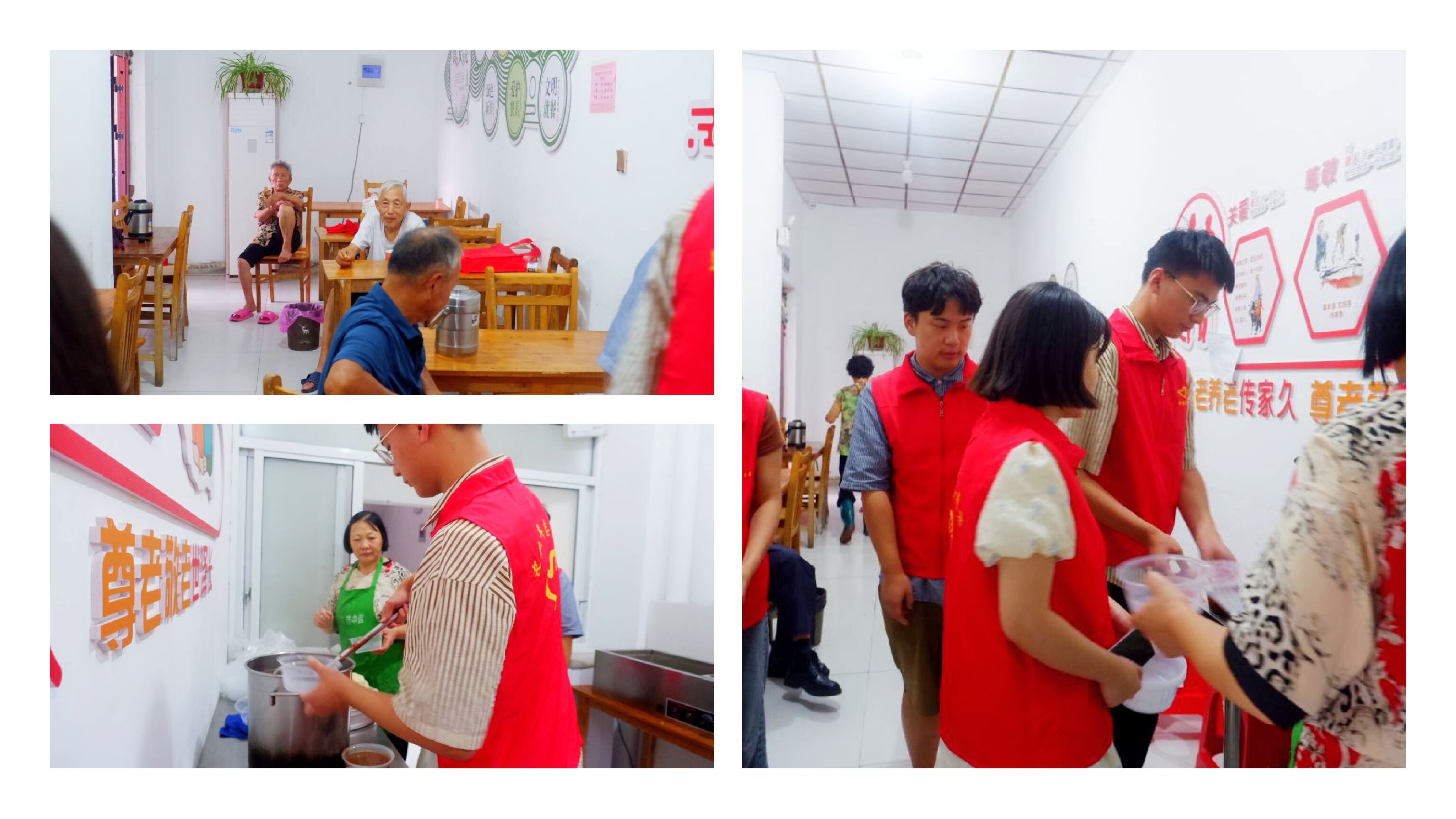 明亮宽敞的室内环境,伴随着一道道家常菜的香味,老人们聊着家常,吃着美味可口的饭菜,脸上洋溢着幸福的笑容。团队成员来到邱集社区老年食堂进行志愿服务实践活动,邱集社区老年食堂采用与当地饭店合作的模式运营,就餐费由老人自费、村集体经济支持、政府补贴三部分组成,让老人花较少的前就能够吃上丰富并的三餐。团队成员们在老年食堂承担起给老人打饭打菜以及打包的工作,大大提高了食堂就餐的效率。通过建立社区老年食堂,把家的温暖延深到社区和乡村,不仅有利于应对逐渐进入老年化社会面对的问题,还有利于推进“老有所养、老有所依、老有所乐”的养老服务体系建设,提升老年人的获得感、幸福感。