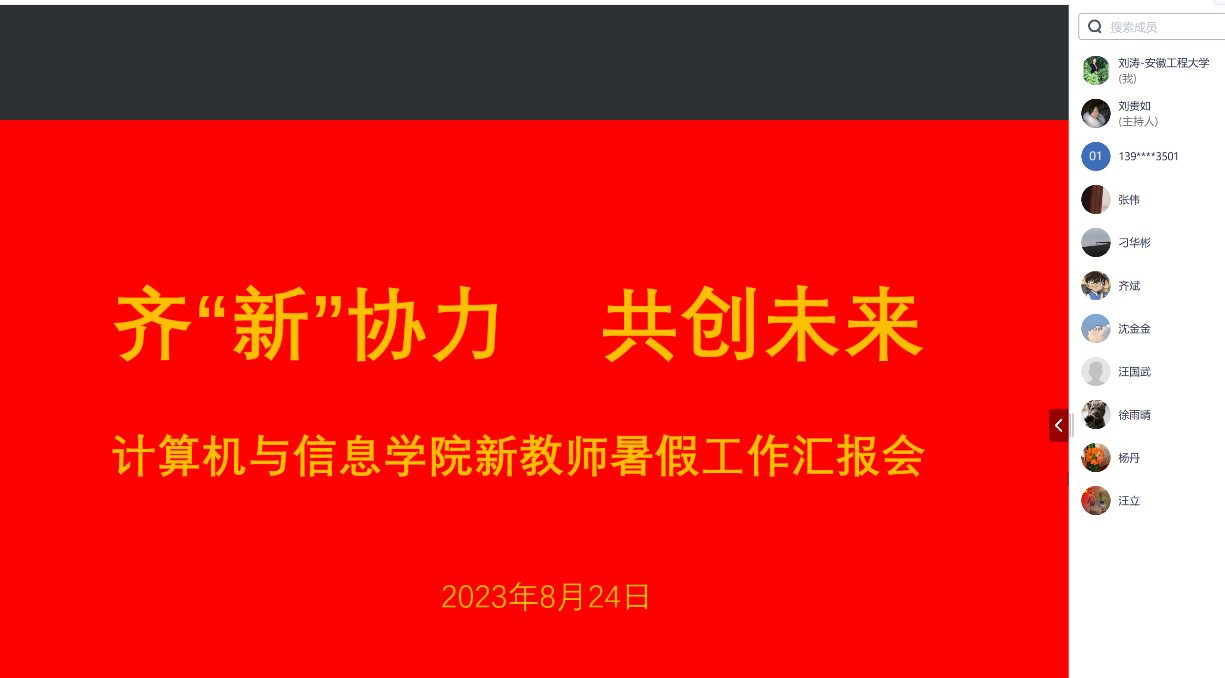 新教师是学院的新鲜血液,是教育教学的新生力量。为进一步做好学院的人才培养工作,更好地服务新教师发展,促进新教师相互了解,全面加强学院新教师教学与科研能力,计算机与信息学院于8月24日晚上在线开展了新教师暑期工作汇报会。计算机学院副院长刘涛、教学督导组教师、2023年新入职的教师参加了本次汇报会,会议由院教学督导组秘书刘贵如主持。