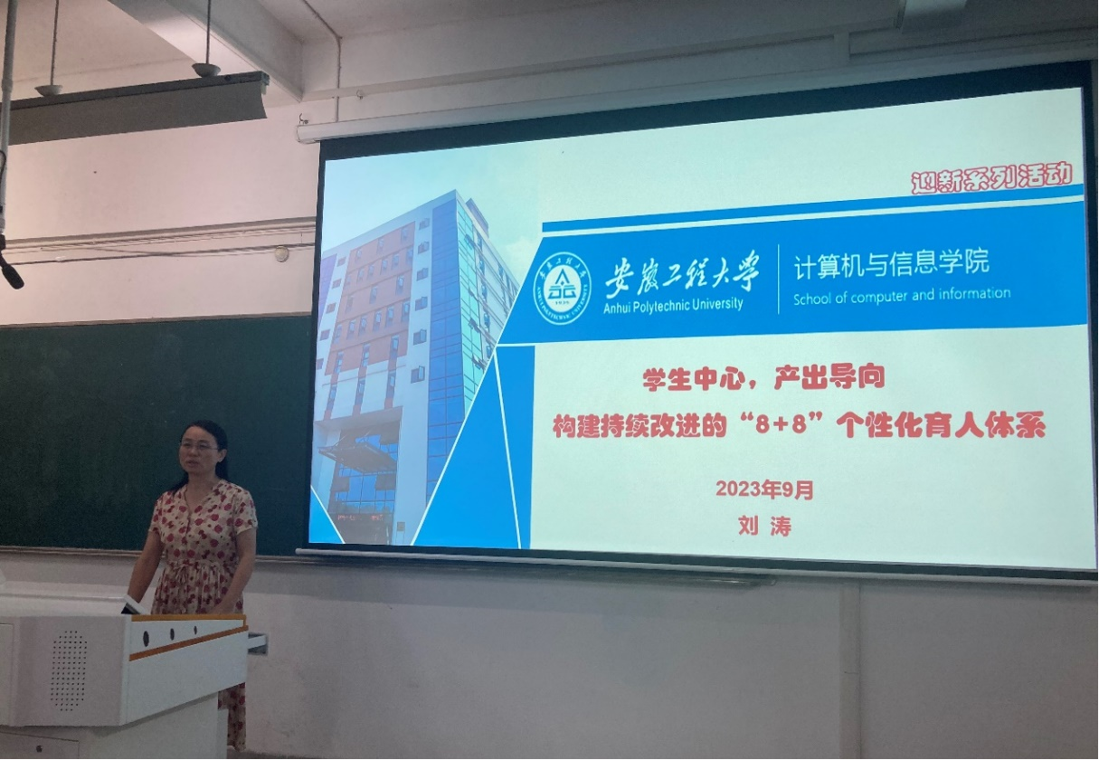 随后,刘涛以“学生中心,产出导向,构建持续改进的“8+8”个性化育人体系”为主题,从学院一流专业建设、分类培养模式、“8+8” 育人体系、“12345”创新创业教育体系、“三全六专”育人实践、个性化人才培养路径、人才培养成效7个方面系统梳理了我院的教学基本情况。特别讲解了计算机科学与技术拔尖实验班、企业定制班招生流程与要求,鼓励学生根据自身兴趣申请不同的定制班提升实践能力;解读2023级院新生数字素养基础大赛通知,动员学生积极准备原创作品参赛,以赛促学提升数字素养技能。她强调同学们应树立专业信心,与学院深入广泛交流,唯有师生携手才能共同成就梦想。