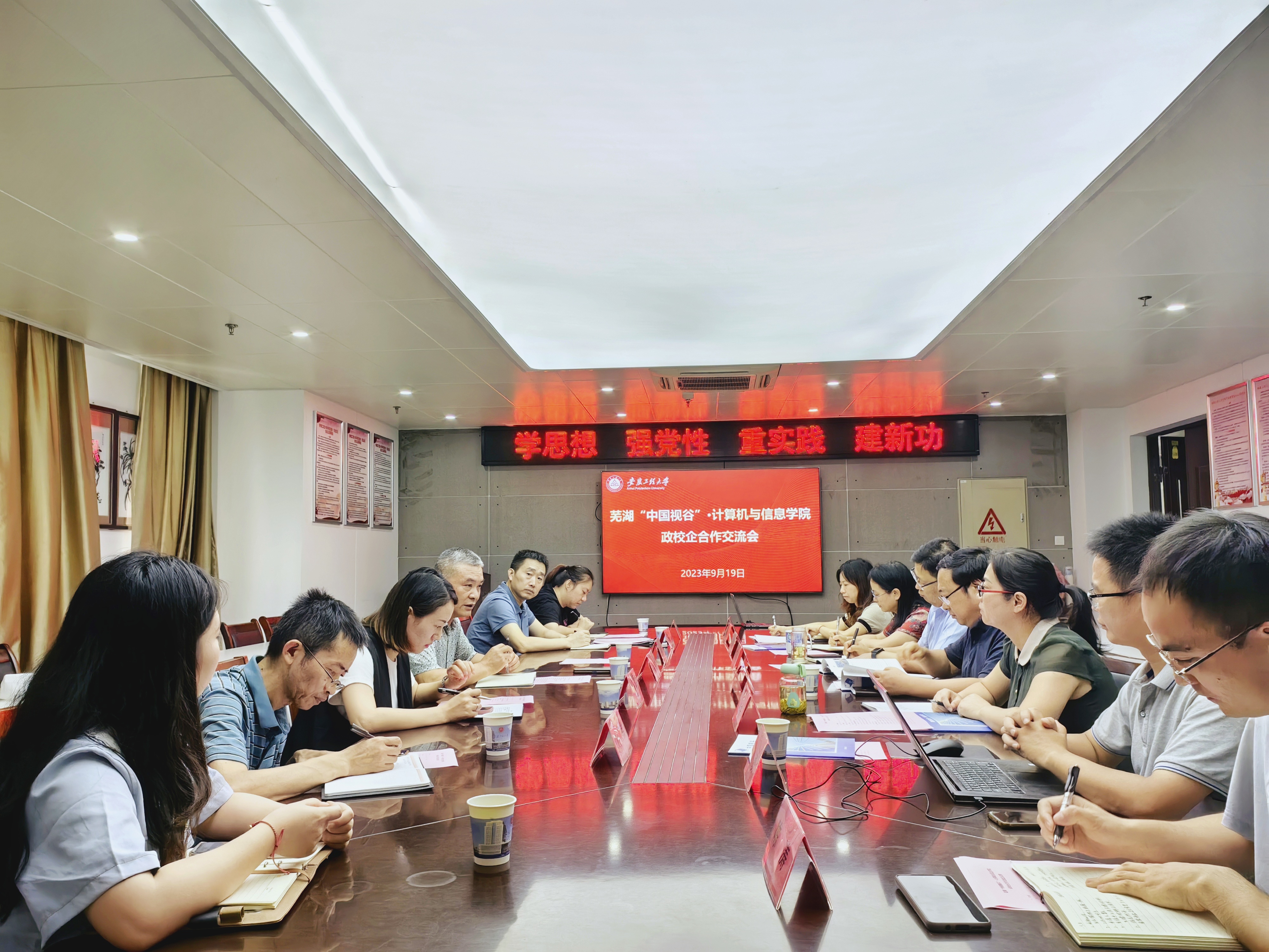 为进一步加强政校企交流沟通,推进深度合作,9月19日下午,芜湖市“中国视谷”建设专项工作领导小组办公室副主任胡兴宏、安徽华谊中控技术有限公司负责人、安徽鸠云天网络科技有限责任公司负责人一行到计算机与信息学院开展合作交流,学院领导班子成员、毕业班辅导员参加交流。