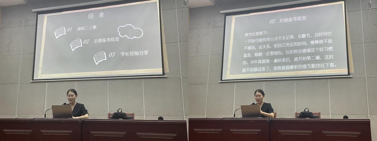 此次分享会不仅为有考研意愿的同学提供了详实具体的经验指导,也为我院建设优良学风、营造浓厚学习氛围提供了有力支持。研考一鸣如雷电,鹏程万里比朝光!希望考研学子们汲取经验的力量,坚定考研的选择,明确目标,奋勇前行。