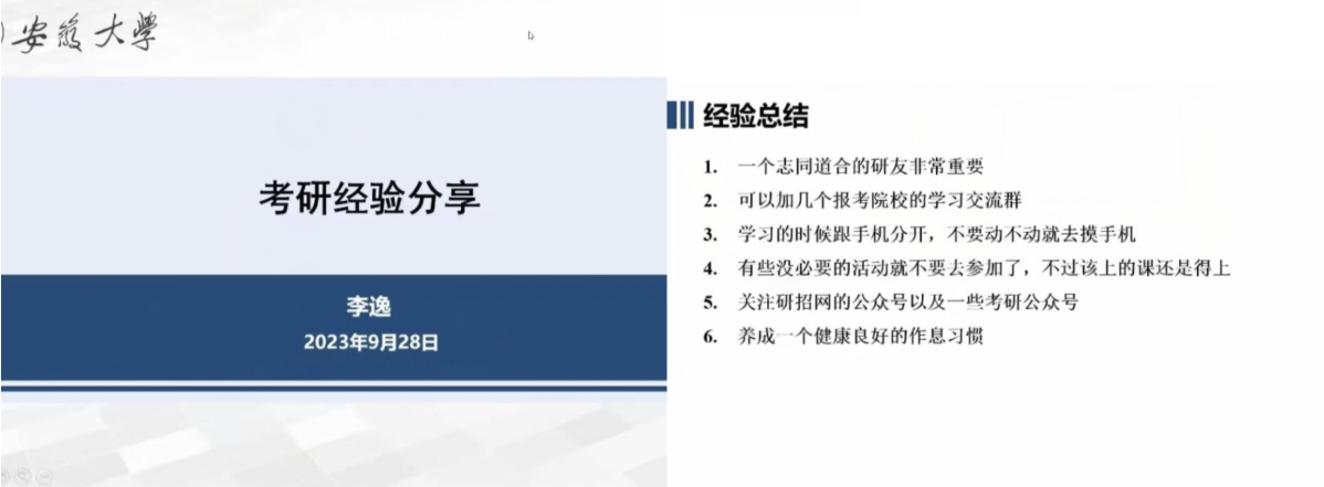 随后,安徽大学人工智能学硕在读的李逸同学,虽身在合肥无法线下参与此次会议,通过腾讯会议,以自身成功的考研经历,向母校的学弟学妹们提出了有效的考研建议、分享了他个人的学习经验与体会,并鼓励考研学子加强合作,为学弟学妹们加油打气,坚持到最后,一研必胜!会后,李逸同学积极为学弟学妹们答疑解惑。