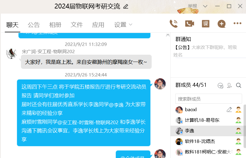 为便于及时回答物联网工程专业2024届学弟学妹们的问题,李逸学长已加入了2024届物联网工程专业的考研交流群,同在群内的还有正在华南理工读研的易号东学长、正在安徽大学读研的柯明仁学长以及正在安徽师范大学读研的沈锶杰学长。