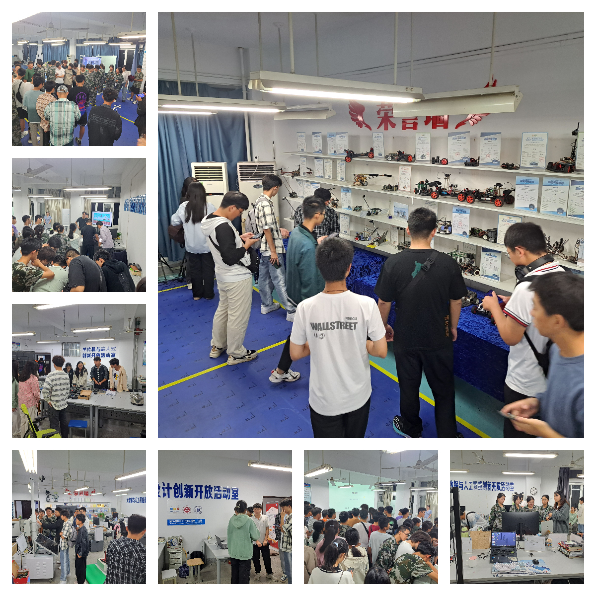 在创新创业教育中心现场参观环节,23级全体学生在各专业学长导员的带领下分4个批次实地参观了创新创业教育中心的8个创新开放活动室。各创新开放活动室纷纷拿出自己的创新创业成果进行展示体验,同学们现场观看了智能车、机器人、无人机等创新作品的表演,各创新开放活动室师生负责人与前来参观的新生进行了深入的交流。
