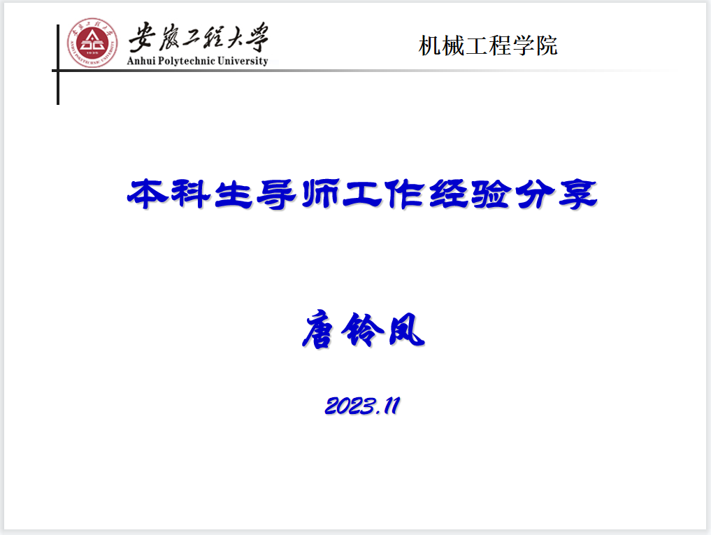 2023年11月15日下午,应我院邀请,机械学院唐玲凤教授在会议室622做了本科生导师工作经验分享的报告。学院全体本科生导师聆听了本次报告,报告会由副院长王勇教授主持。