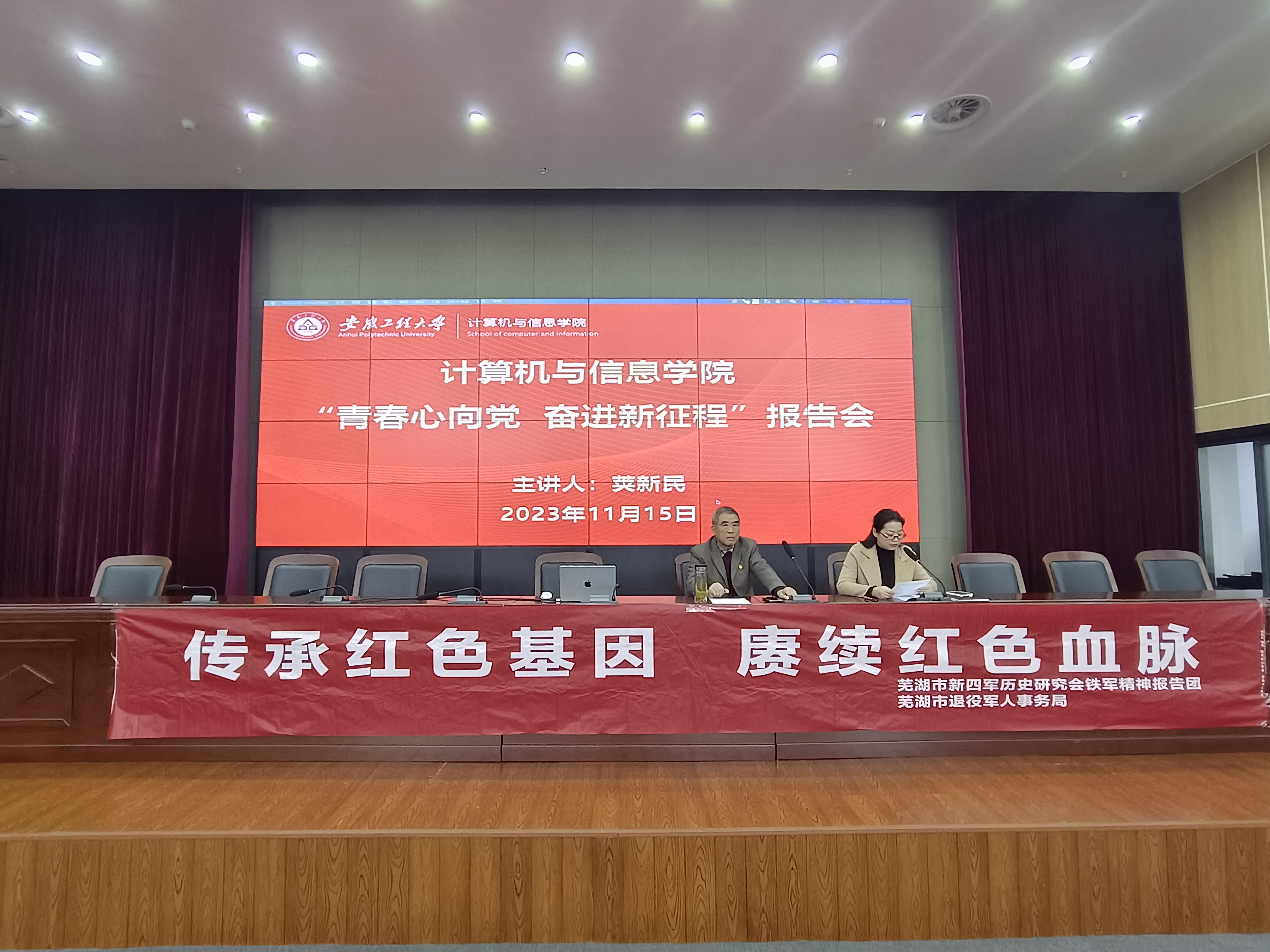 为进一步落实“三全六专”育人实践,传承红色基因,弘扬红色精神,增强广大新生的爱国情操和历史使命感,11月15日下午,计算机与信息学院在图书馆组织开展2023级新生大学生涯规划系列活动“青春心向党,奋进新征程”报告会。我校退休干部荚新民应邀与同学们进行“面对面”交流,芜湖市新四军历史研究会及铁军精神报告团的部分老党员、院党委副书记孙德茹、团委书记吕寅、新生辅导员和全体2023级新生参加了本次活动,报告会由孙德茹主持。