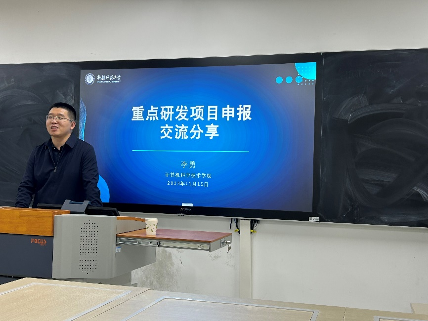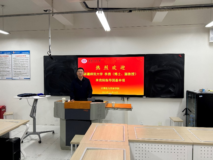 2023年11月15日下午,应我院邀请,新疆师范大学计算机科学技术学院副院长李勇在计算机与信息学院智慧教室520做了题为“重点研发项目申报交流分享”的报告。拟申报2024年国家自然科学基金教师聆听了本次报告,报告会由副院长王勇教授主持。