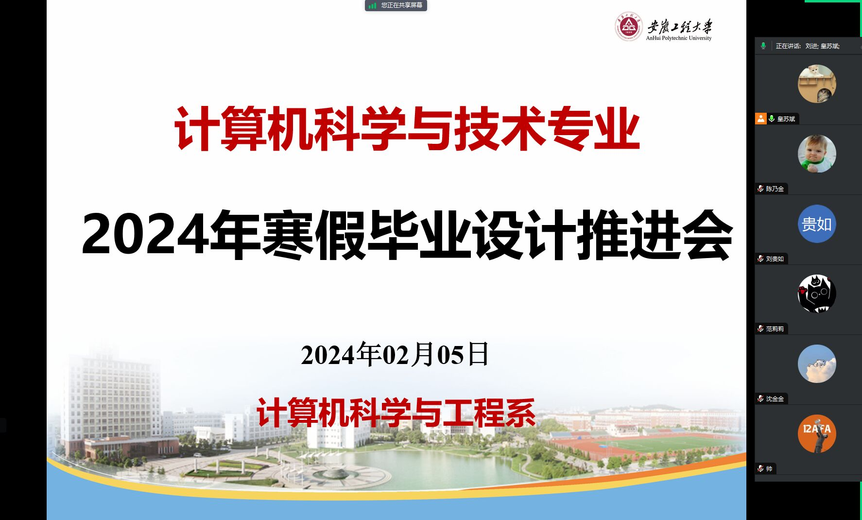 为更好落实寒假期间2024届本科毕业设计工作任务,了解教师指导情况,2月5日,计算机科学与工程系线上召开了计算机科学与技术专业2024届本科毕业设计工作推进会。计算机科学与工程系全体专业教师参与了推进会,本次会议由系主任皇苏斌主持。