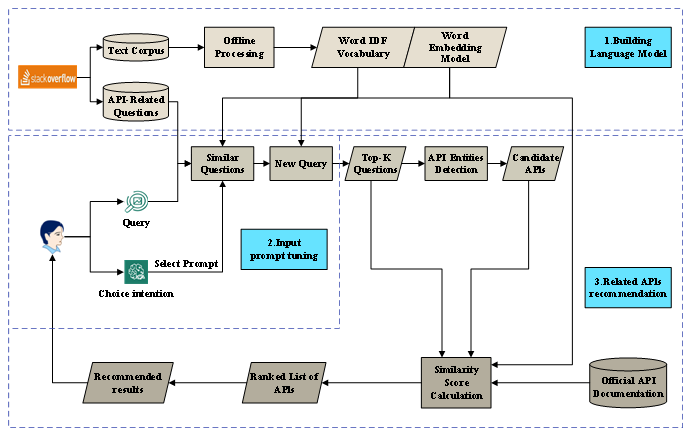 具体来说,该研究采用用户查询增强的方法,首先通过用户的查询搜寻Stack Overflow中相似的帖子,用户根据帖子的标题选取最符合自己意愿的作为提示。然后,将得到的提示与用户初始输入合并成新的查询。最后,新生成的问题与Stack Overflow帖子和API官方文档双信息源计算相似度,在两者综合得分下得到最后的候选API序列。该研究具有重要理论研究意义和实际应用价值,为API推荐提供了一种崭新的思路。
