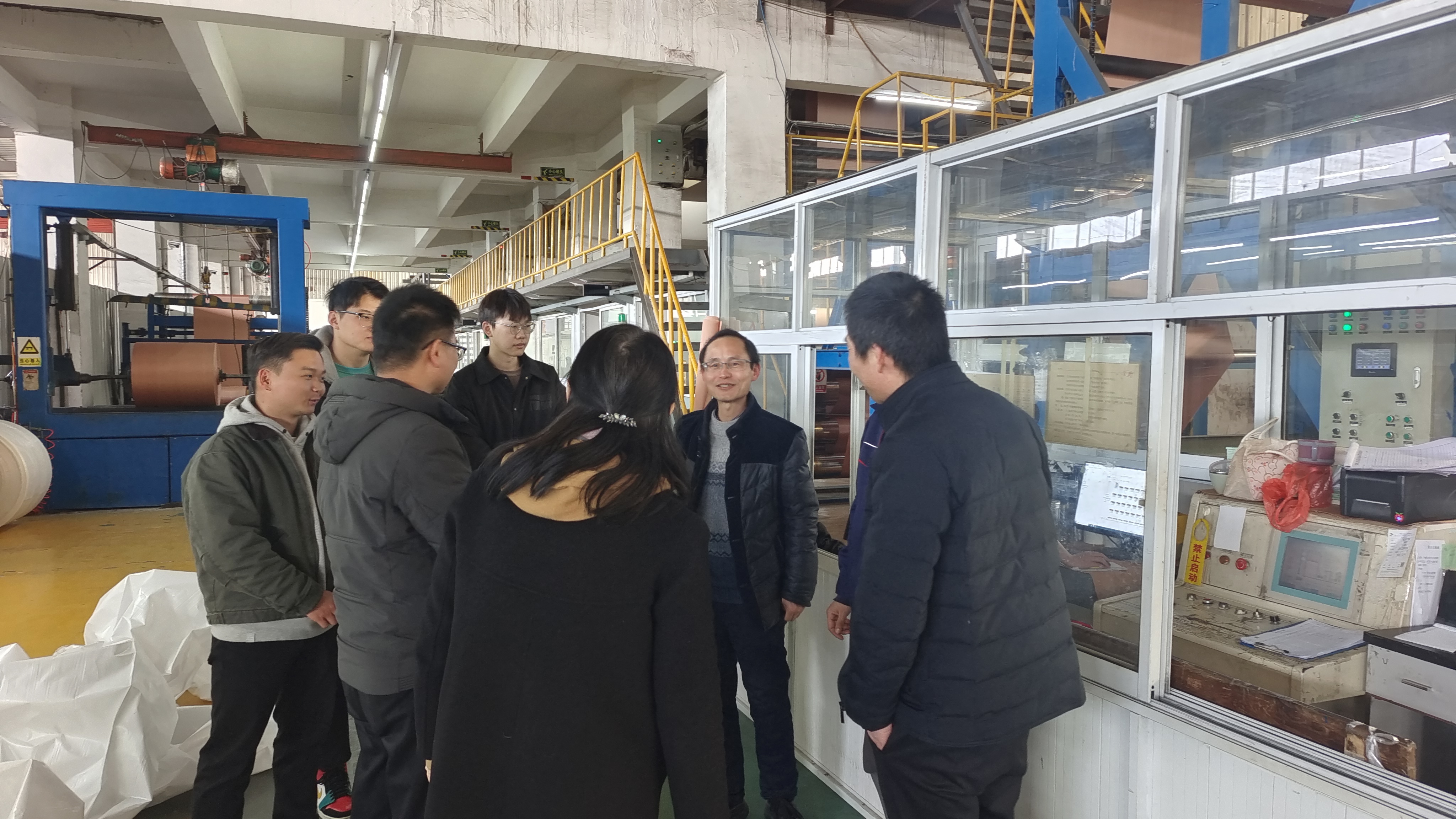 会后,修宇老师带领学院研究生和本科生参观了浸胶、整经、织造、捻线等生产流程。在浸胶生产线就浸胶阶段布面疵点的数据采集与分析问题与企业工程师和质检人员进行了深入交流,在整经生产线探讨了识别纱线打结可能的解决方案。通过深入企业调研,帮助学生们亲身感受到疵点,纱线松散、打结等看似细微的问题,实则对整个生产效率和最终产品品质产生的显著影响,强化了学生应用所学知识解决实际工程问题的意识与能力。