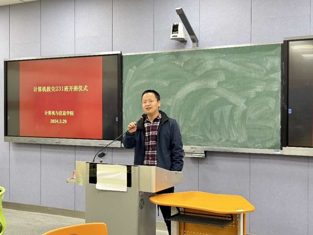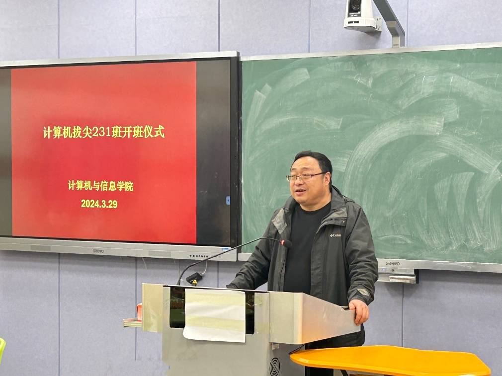 近日,计算机与信息学院第二届计算机科学与技术拔尖班开班仪式在4J112举行。学院党委书记李卫东、党委副书记孙德茹、教学副院长刘涛、系主任皇苏斌、研究室导师代表刘进、拔尖班辅导员陈安、班主任李志玲及第二届35名同学参加了开班仪式。
