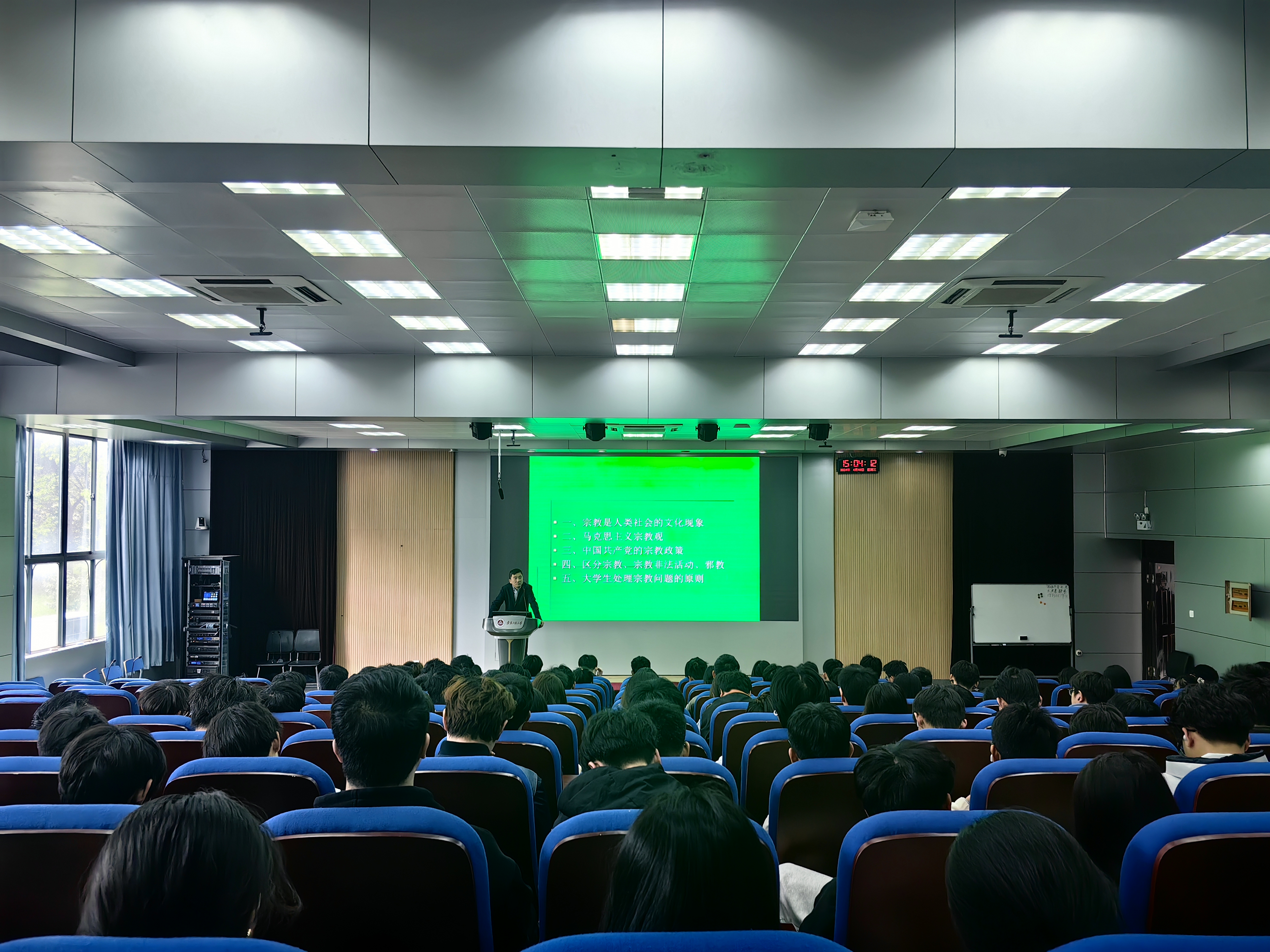 刘聪向同学们介绍了宗教的产生、作用及其本质,他围绕党对宗教基本问题的认识、党的宗教政策发展阶段、党的宗教工作方针和党的宗教政策主要内容详细阐明党的宗教政策。针对学生骨干群体,刘聪着重讲述了包括合法场所、合法团体、合法身份、合法内容在内的宗教四大合法性,强调合法的宗教活动必须满足四个要素,教育引导学生甄别宗教非法活动,并指出邪教的特征和极大危害性。刘聪勉励学生加强学习,不断提升个人素质,坚定信仰不动摇。刘聪老师授课方式深入浅出,内容丰富生动,紧密联合学生实际,软件222思政委员郝明鑫表示:“刘老师引经据典,用一种具象的表述使我更加深入地理解了马克思主义宗教观,也加深了我对党的宗教政策的理解,受益匪浅。”