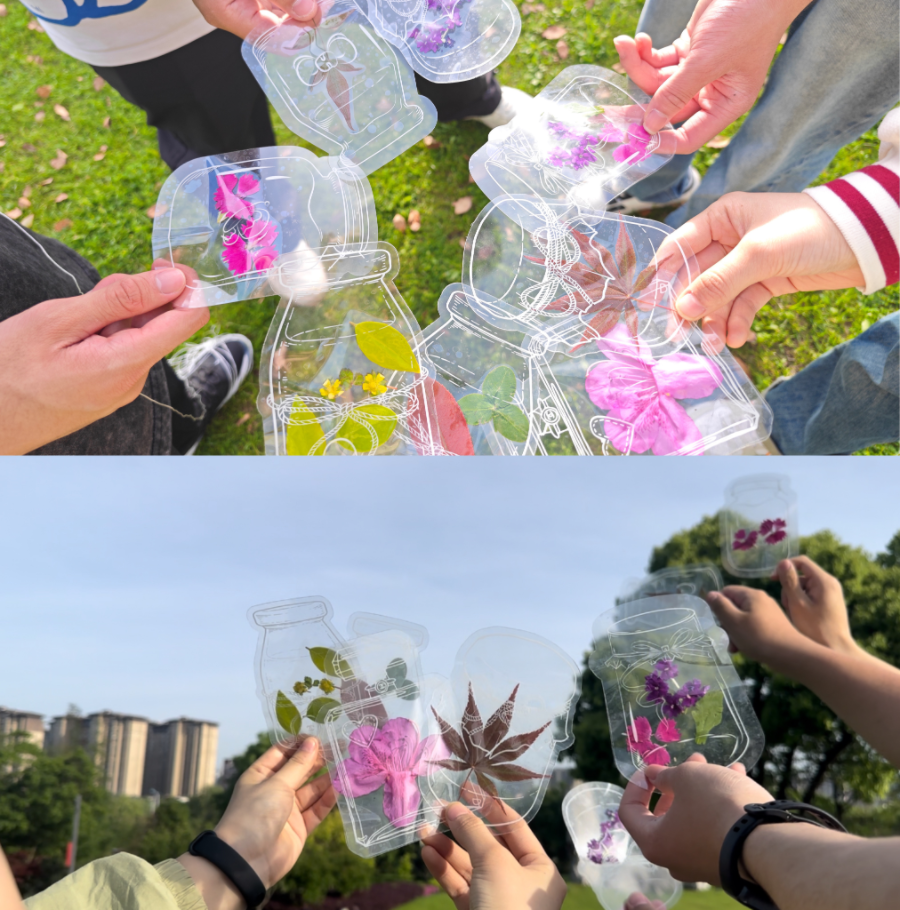放完风筝后,同学们成群结伴在公园里拾取树叶和花瓣,亲手制作出了独具匠心的植物标本书签。绿叶与鲜花巧妙融合,一张张精致的书签在指尖诞生,把沐浴春光的植物装入透明书签,永久保留这抹春色,犹如一件件艺术品。书签制作完毕后,大家将其汇集起来进行展示,不少同学将自己亲手制作的书签赠送给朝夕相伴的室友,互赠书签,暖暖春光见证了同学们友谊的升华。
