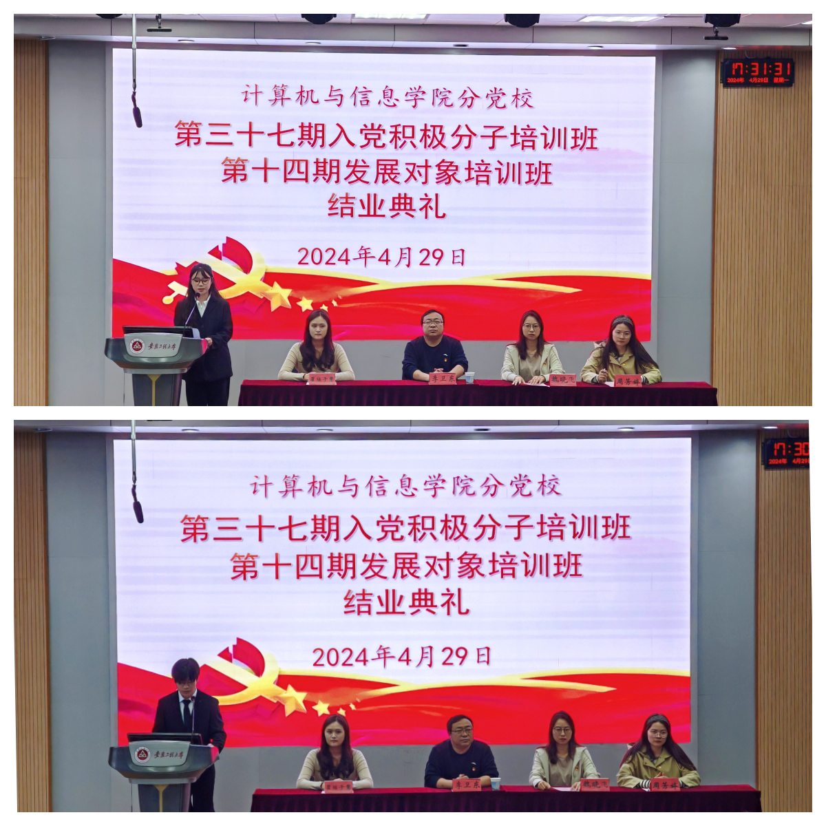 为深入推进学校“三全六专”育人实践,确保党员发展质量,引导学生“正”起来,4月29日下午,计算机与信息学院分党校第三十七期入党积极分子暨十四期发展对象培训班结业典礼在5J117举行,学院党委书记李卫东,辅导员魏晓飞、周芳婷,培训班班主任陈安、瞿陆子慧及全体学员参加。