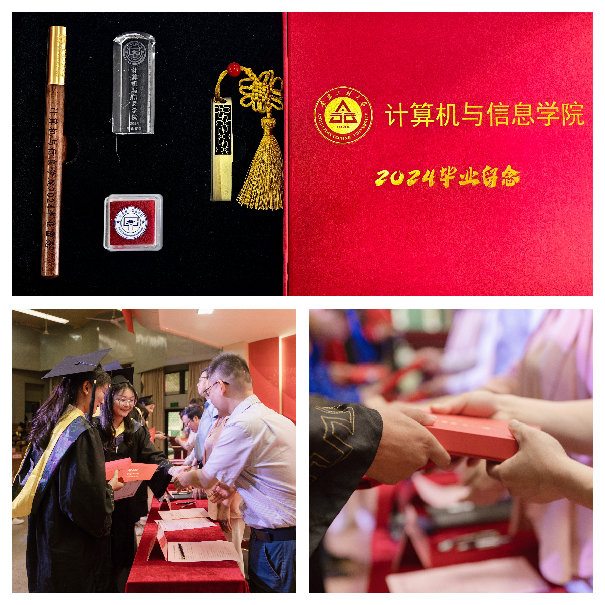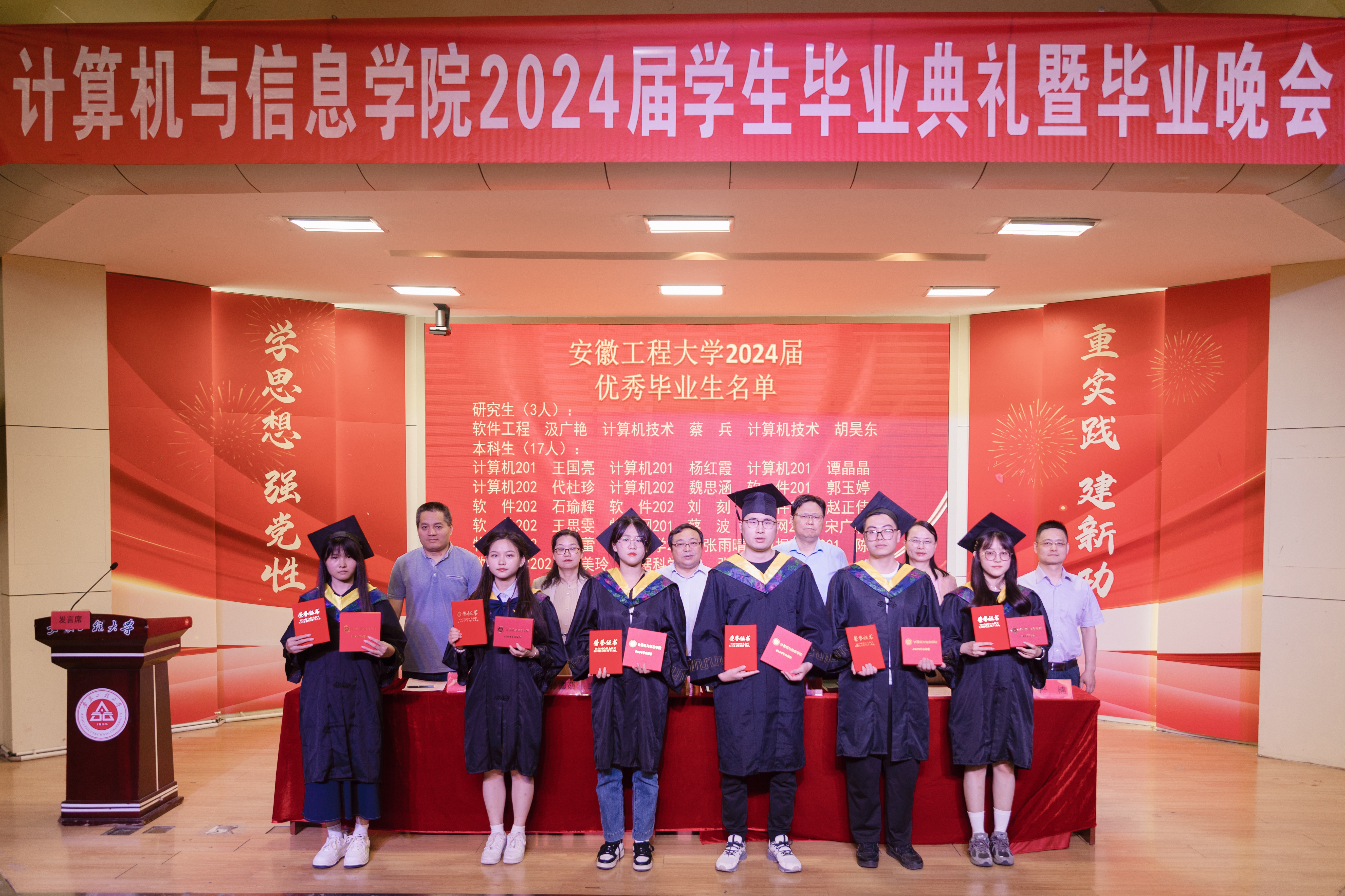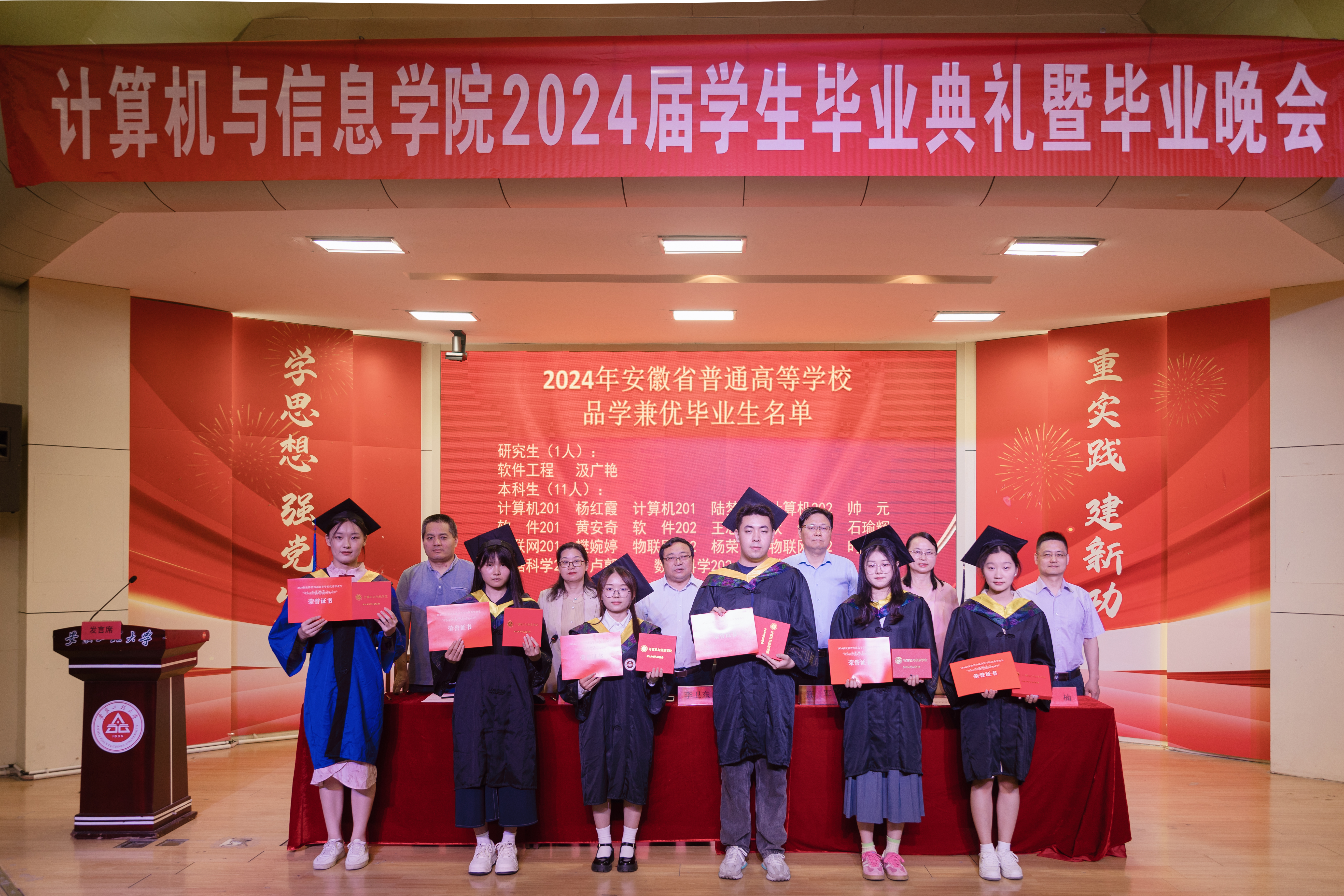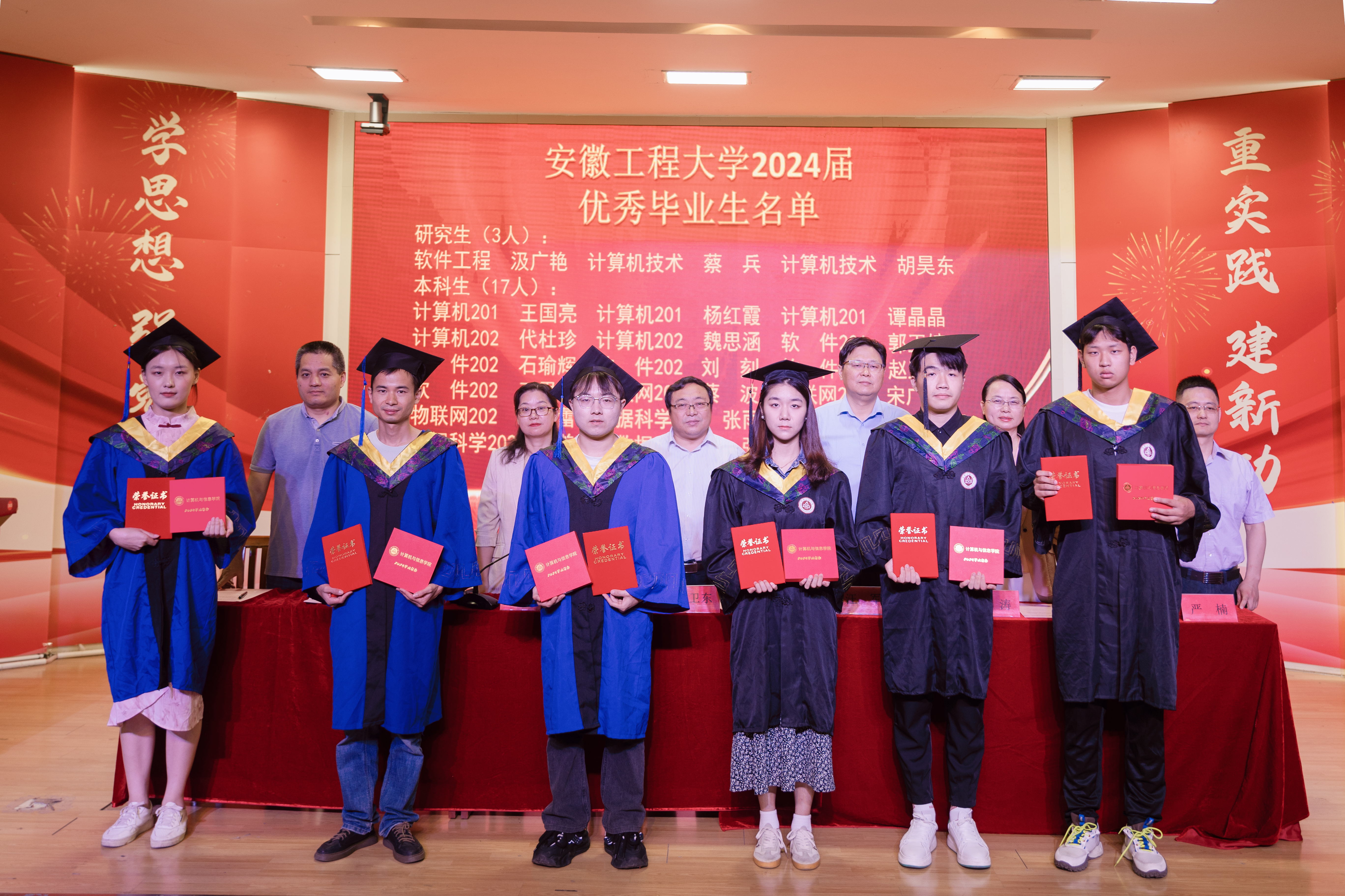 汪军宣读2024年安徽省普通高等学校品学兼优毕业生表彰名单,刘涛宣读RayBetApp官网下载 2024届优秀毕业生名单,学院领导和老师代表为优秀毕业生颁发荣誉证书并赠送毕业纪念品。