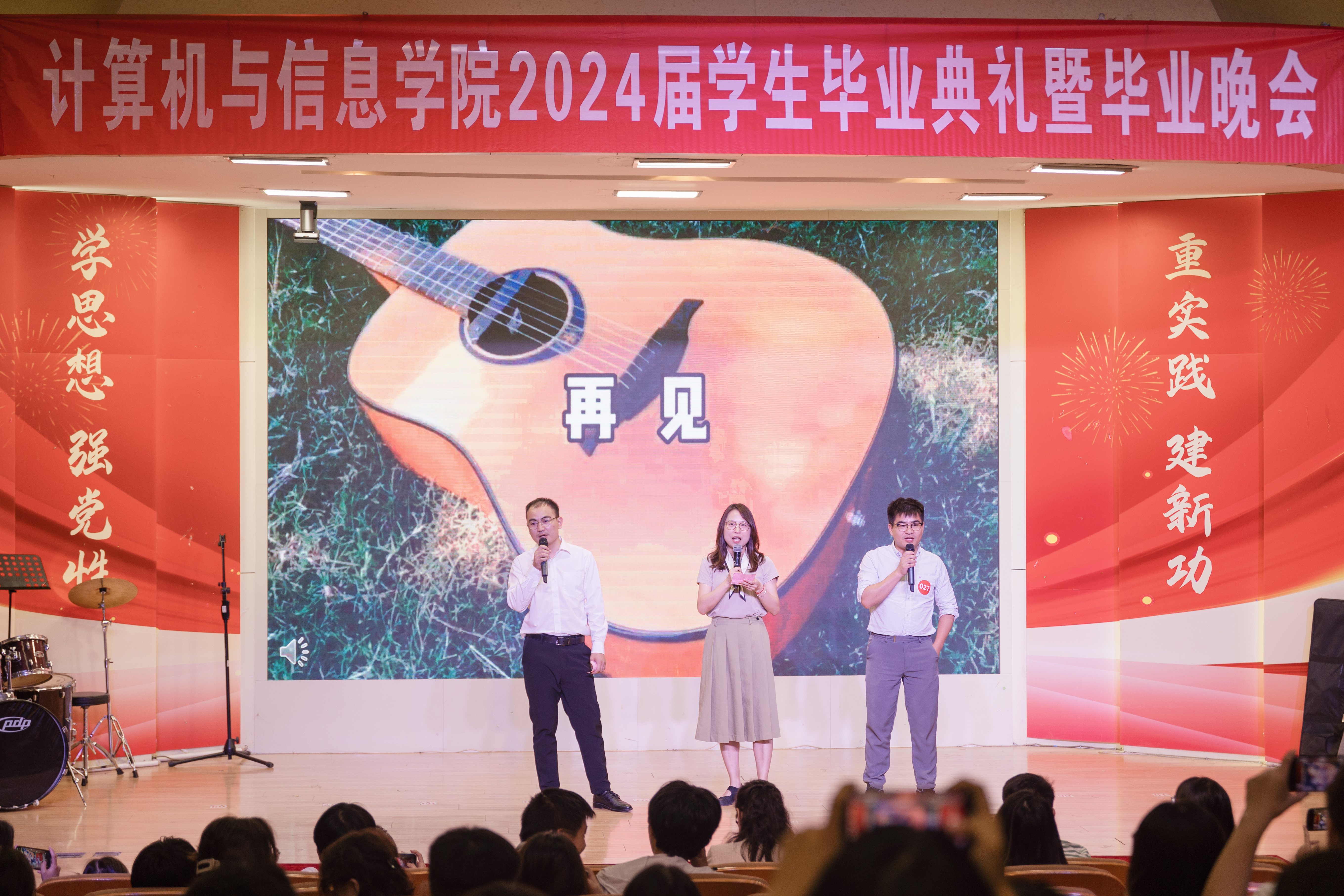 为给即将远行的毕业生留下更难忘的回忆,毕业典礼结束后,学院精心准备了毕业欢送会。物联网201李杰、计算机201唐彬峰、数据科学202李阳、计算机202杨凌轩倾情献唱,为大学生涯画下完美句号。毕业班辅导员魏晓飞、陈涛、孙力力在欢送会最后合唱《再见》,希望和毕业生们相聚有时,后会有期。互动环节,学生会“青年之家”准备好了祝福卡片,当场随机抽取明信片送给即将离校的学长学姐,卡片上写满学生会人员在全院范围内征集的祝愿与祝福,希望学院2024届毕业生在新的征程上展现青春作为、彰显青春风采、贡献青春力量,奋力书写中国式现代化挺膺担当的青春篇章。