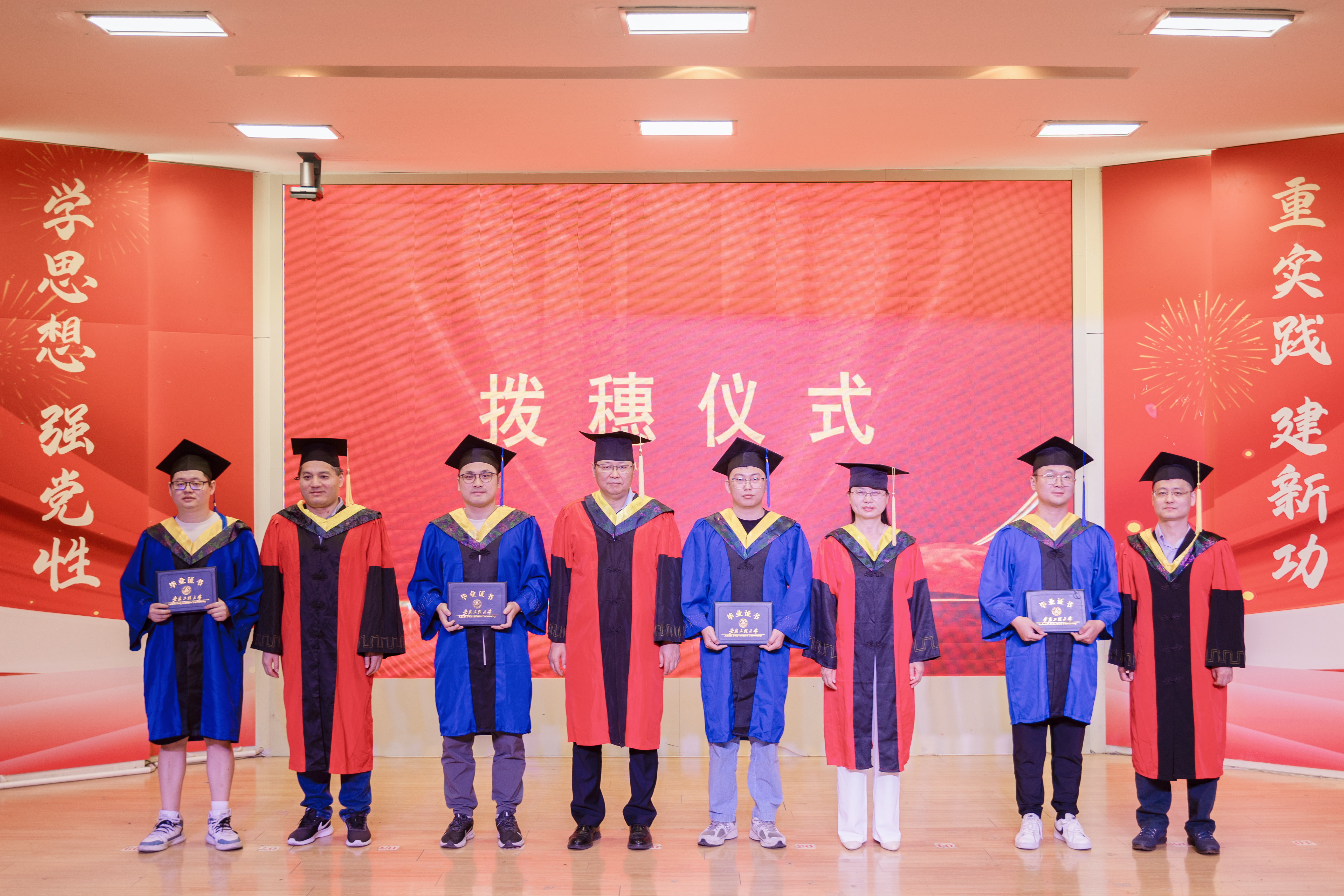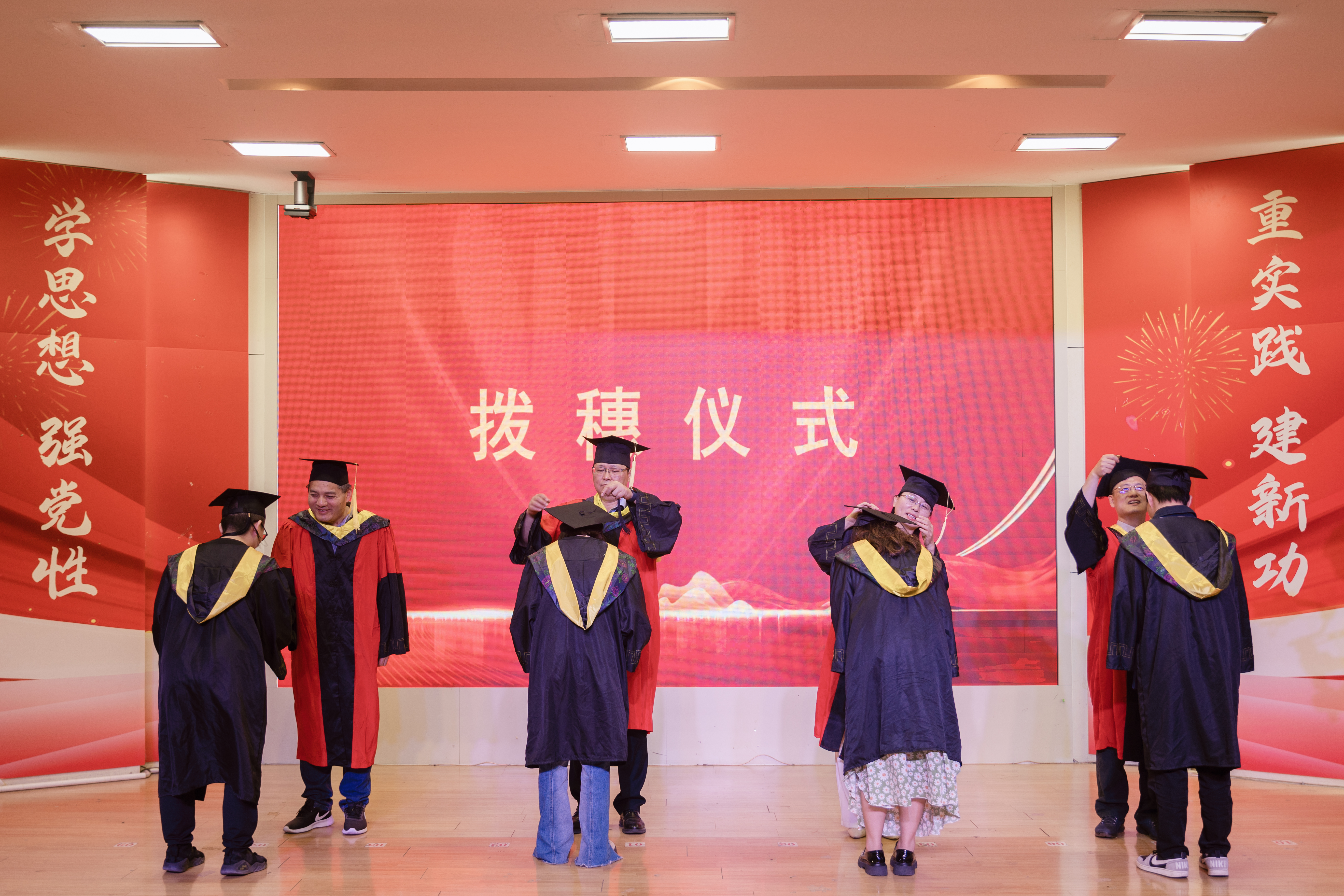 拨穗环节,汪军、刘涛、严楠、卢桂馥共同为毕业生们扶正流苏并合影留念,记录难忘的时刻。