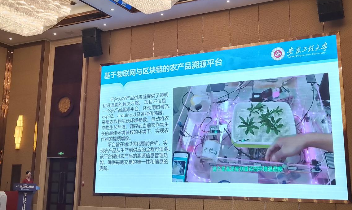 在安徽“双创汇”上,包象琳进行了精彩纷呈的科技成果的发布汇报,她结合走访当地多家企业所探寻的行业痛点问题和丰富案例,介绍了已经落地的智能设备维保平台、基于区块链和物联网的农作物溯源平台等科技成果,这些成果不仅体现了学校科研的创新性和前瞻性,也吸引了与会企业和投资者的广泛关注。