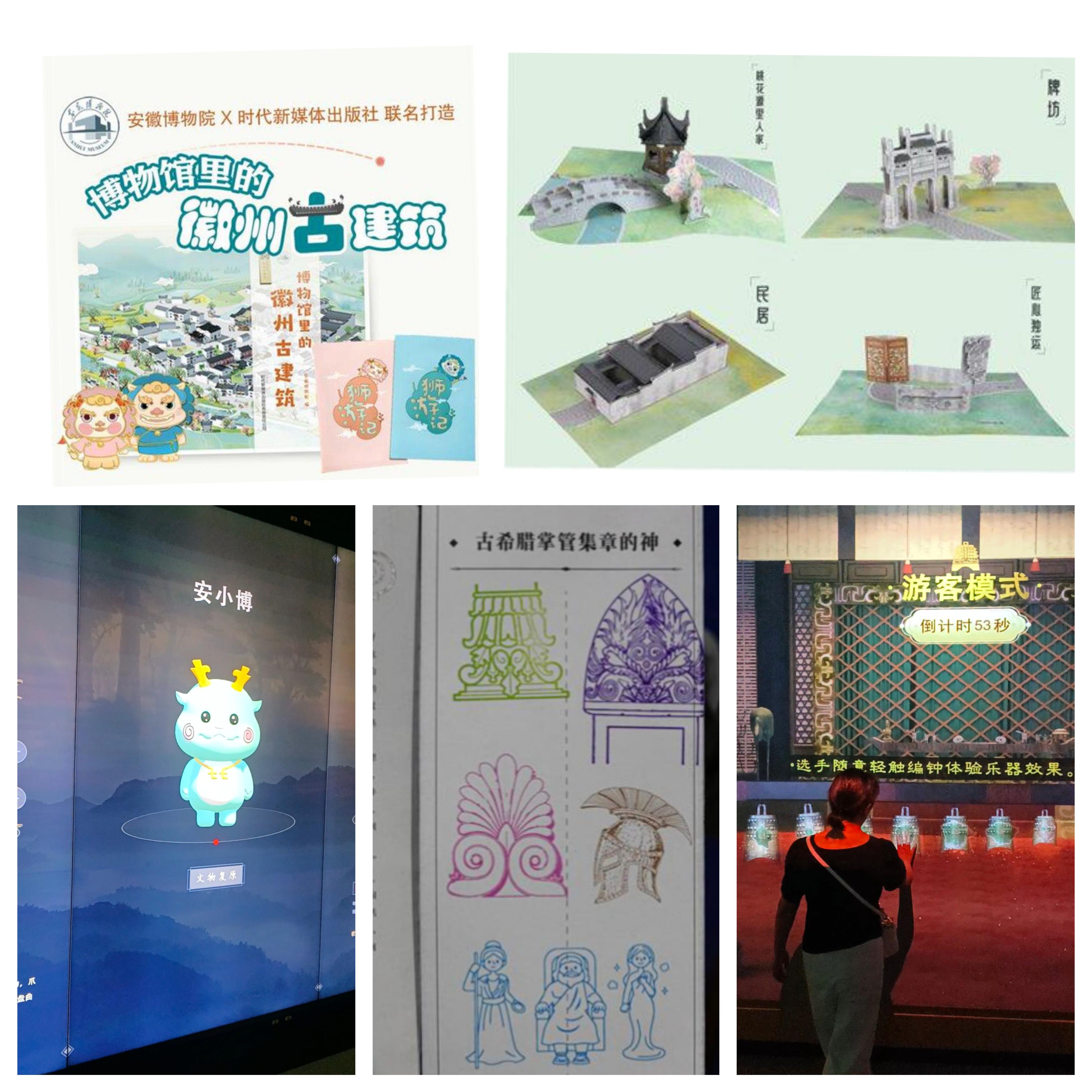 除了展厅参观,还有丰富的互动体验。用手机端可以下载徽州古建筑电子书、益智有趣的建筑纸模立体书拼搭、中国狮和安小博等动漫周边形象、古希腊掌管集章的神等等。团队成员也体验了馆内更多3D展览,如VR看场景、大屏博物闯关游戏挑战等等,展品呈现结合现代科技,给予更强的体验感,玩中伴学,印象深刻。