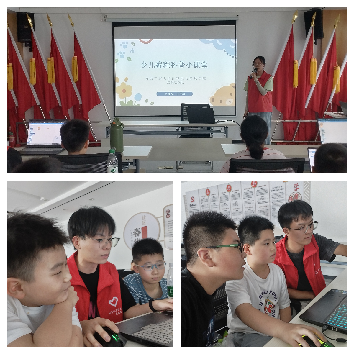 8月3日下午,镜湖区春江社区新时代文明实践站内洋溢着浓厚的科技氛围与纯真的童声笑语。随着“编程科普启梦想,慧心巧思展童趣”少儿编程系列活动的温馨启幕,计算机与信息学院双创中心功能型党支部组建的暑期社会实践团队携手社区党委、关工委为青少年科技创新与健康成长之路开启新征程。