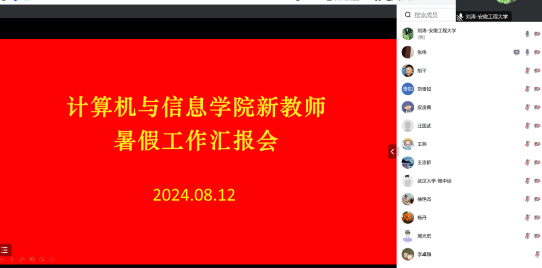 为进一步提高教师教学能力和教学水平,让新教师更好融入学院教学科研环境,促进新老教师之间的互动和交流,加速新教师成长,计算机与信息学院于8月12日举办了线上“新教师暑期工作汇报会”,会议由学院副院长刘涛主持,督导组教师、2024年新入职教师参加了本次会议。