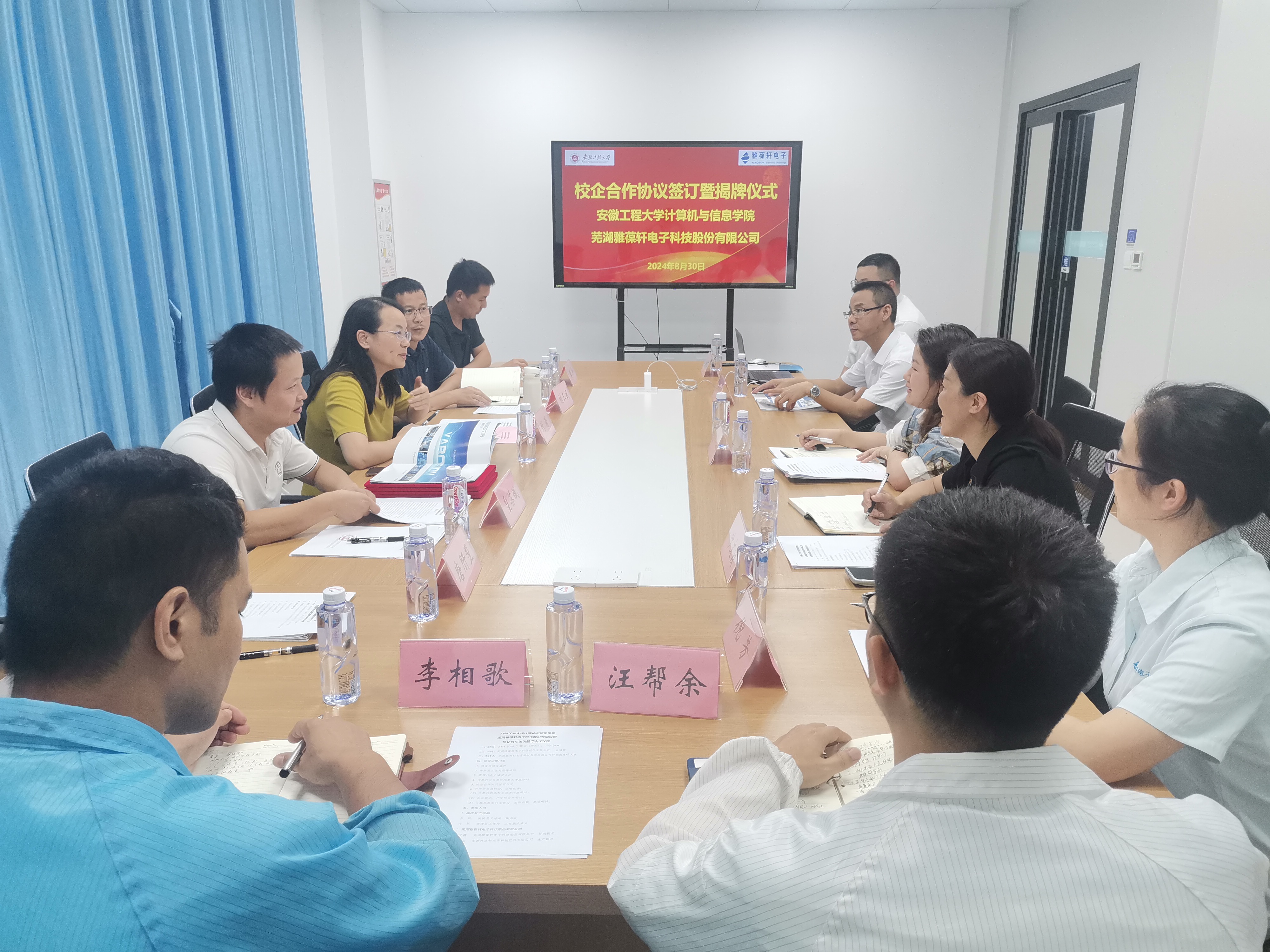 8月30日下午,计算机与信息学院与芜湖雅葆轩电子科技股份有限公司在雅葆轩会议室隆重举行了校企合作协议签订暨揭牌仪式。南陵县工信局副局长肖玲;雅葆轩电子行政副总叶文霞、生产副总冯根海、研发经理倪芳、生产经理汪帮余、工程主管李相歌、行政专员伍隽翀;计算机与信息学院副院长刘涛,专业骨干教师刘三民、皇苏斌、章平、唐肝翌参加了本次会议。会议由叶文霞主持。